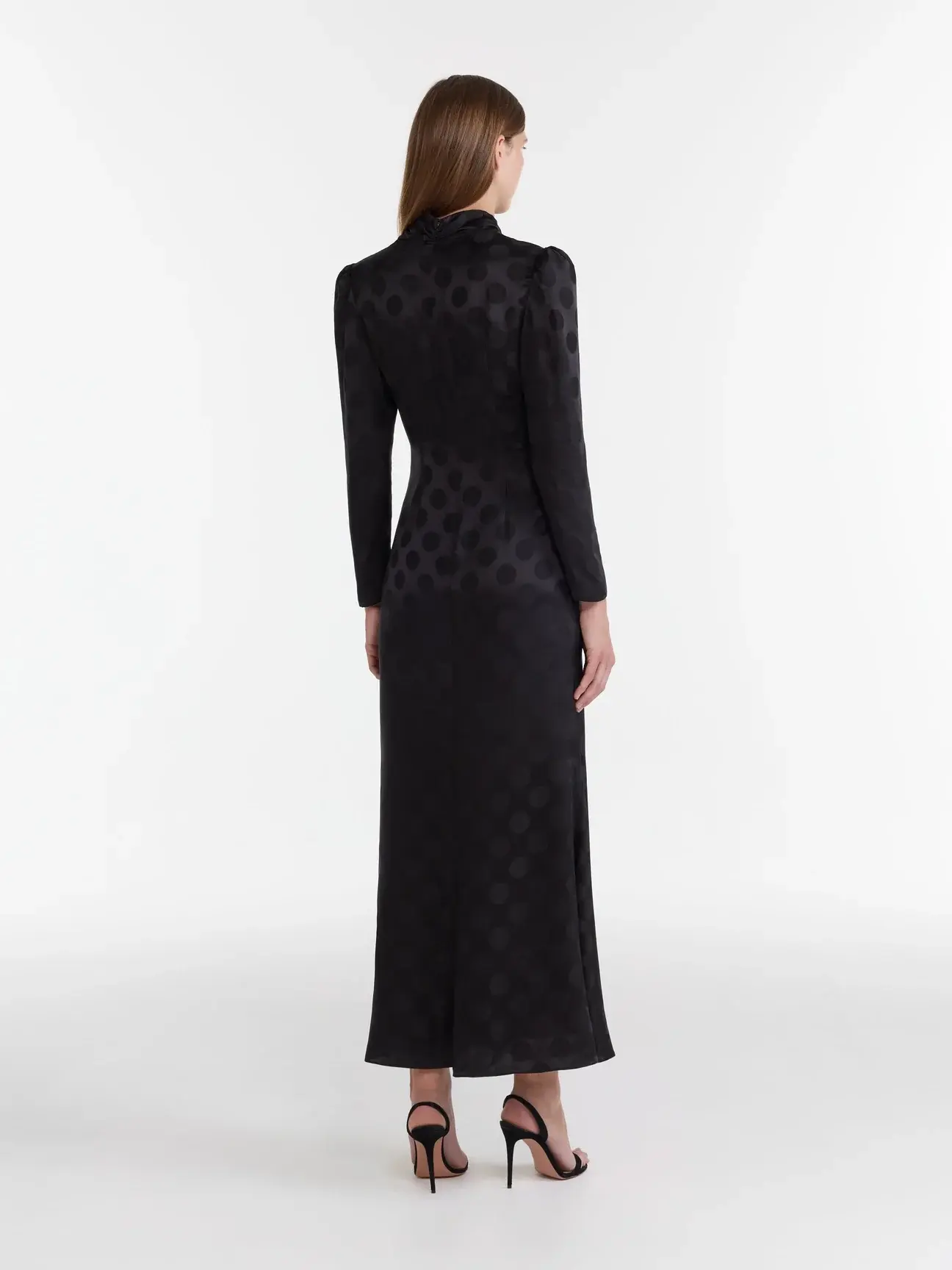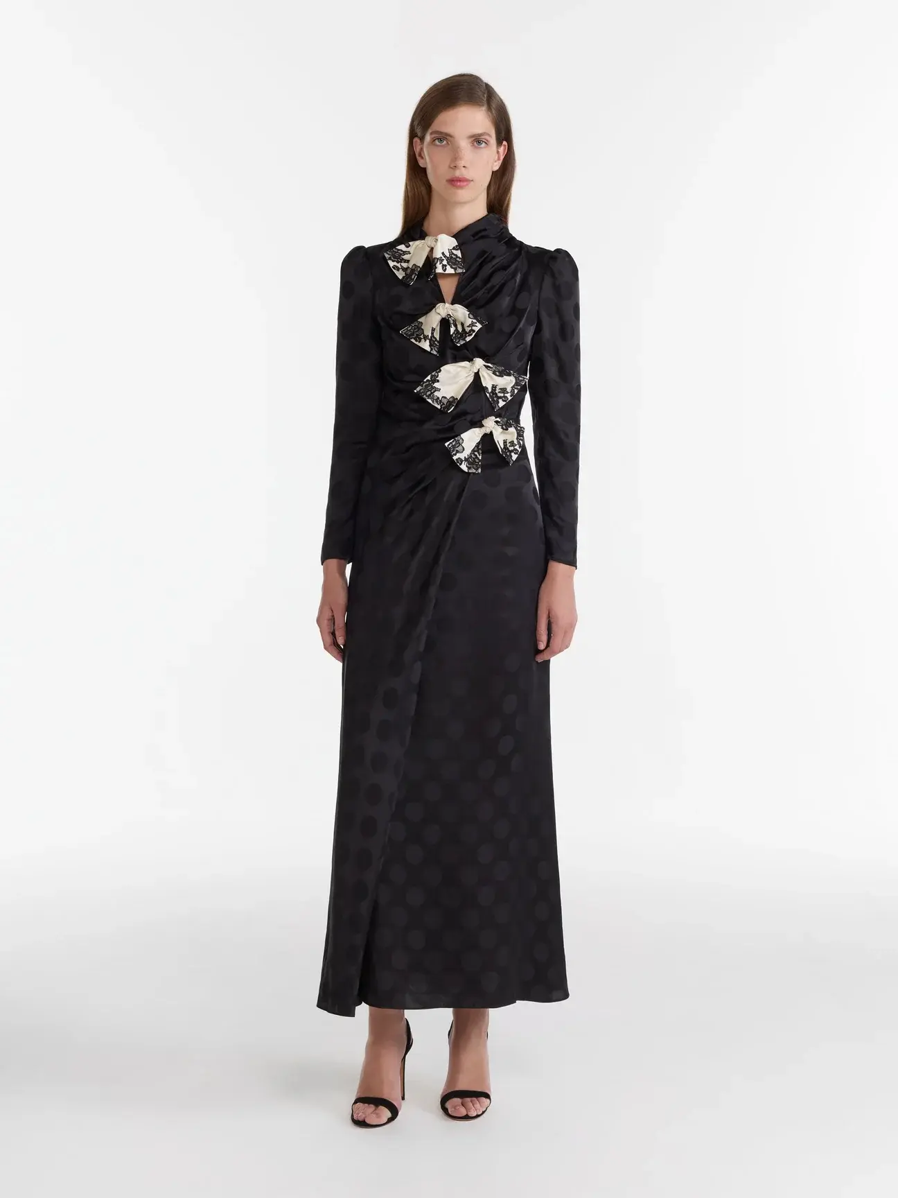 The Kelly-B Dress is a romantic cocktail silhouette crafted from subtle polka dot stamped satin. Long sleeves and a flowing wrap skirt add a soft, flowing movement and ease. The high neckline is accented with gathered bows that arc diagonally across the bodice. The bows are printed with a Trompe l’oeil “lace” that contrasts against the understated, monotone polka base, creating a look that embodies playful, feminine refinement.