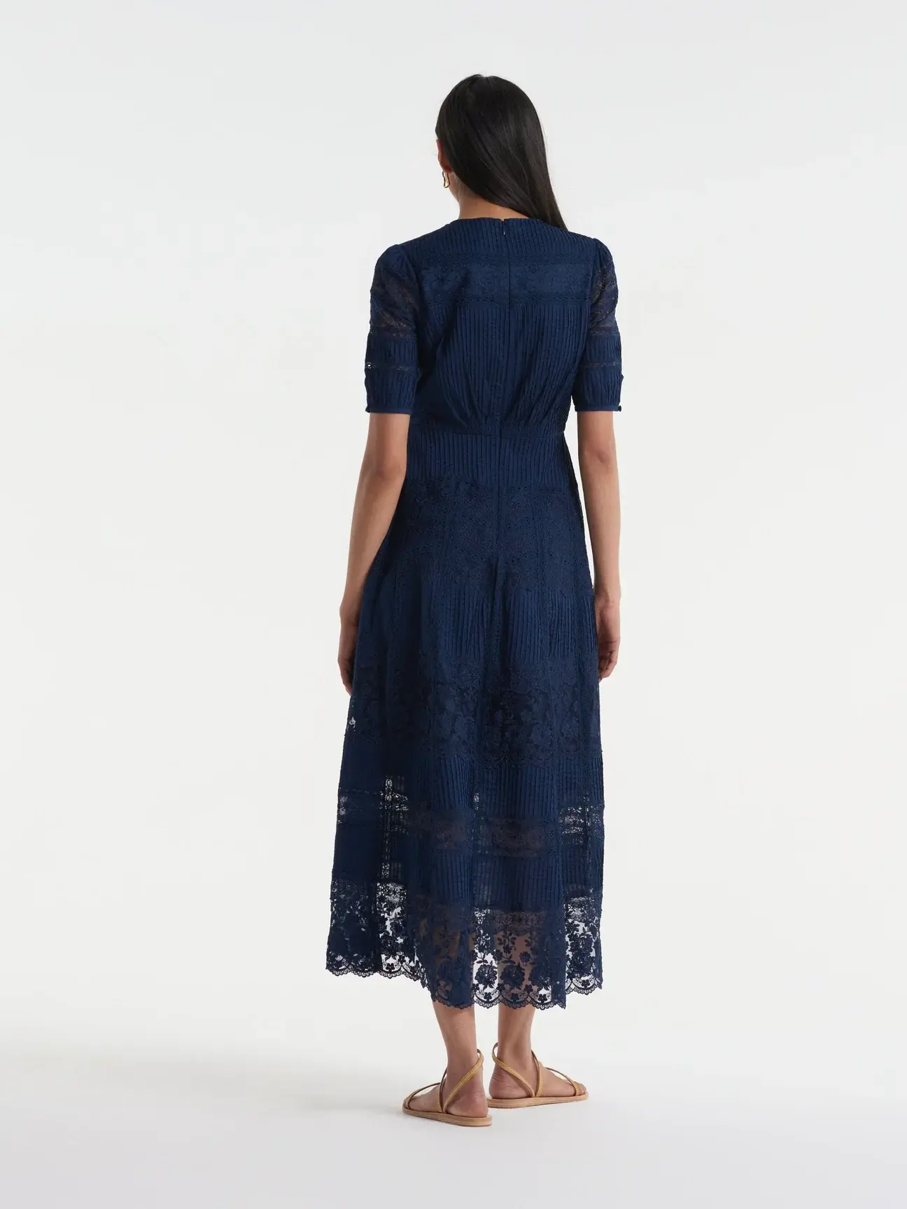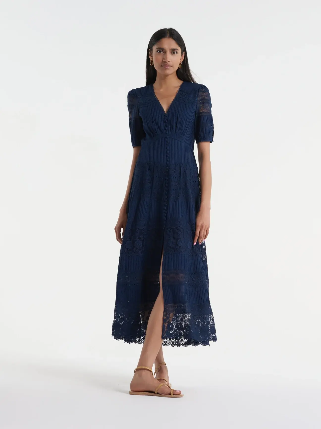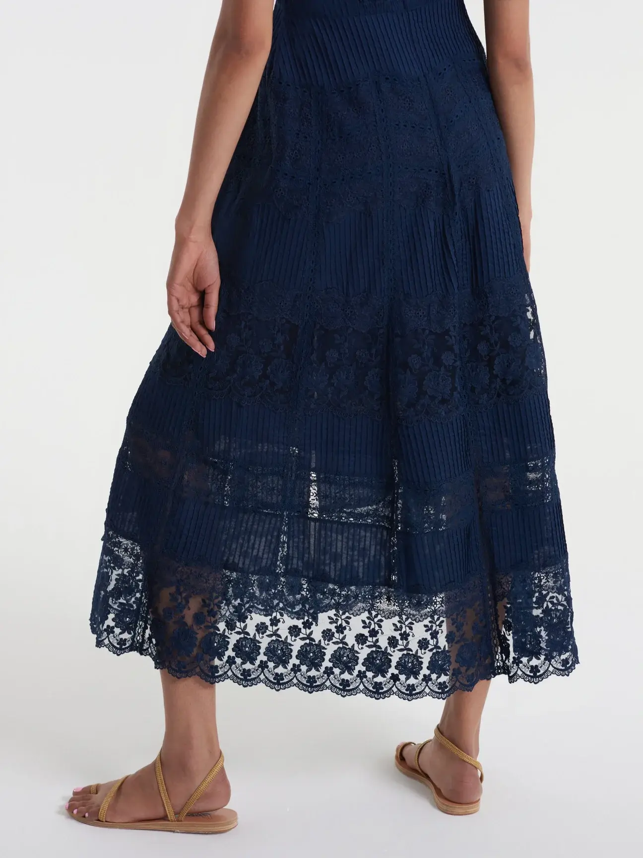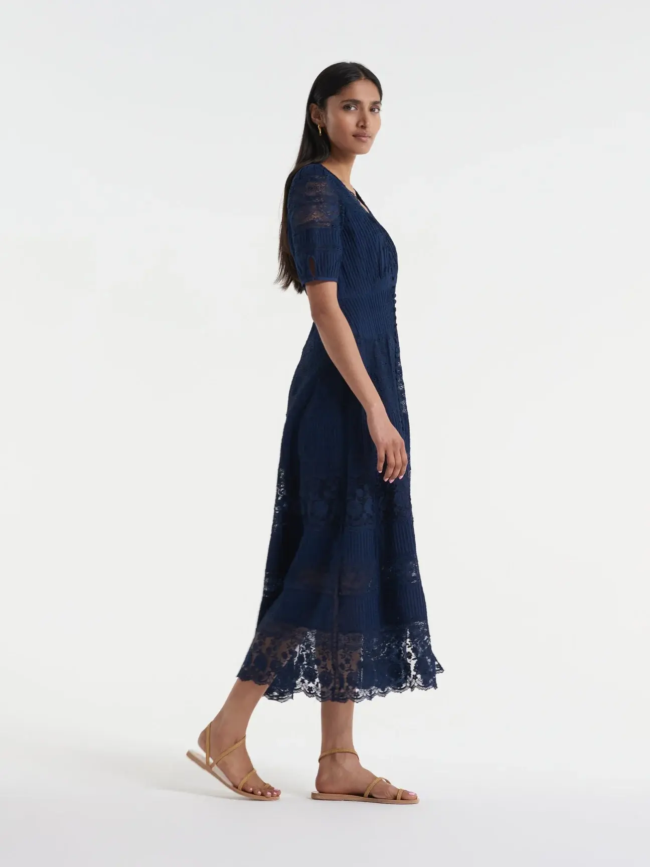 A signature shape, the Lea long lace dress in Navy is a wardrobe favourite. It is cut in a lace cotton fabric in a beautifully realised bias cut, meaning it flatters the figure whilst allowing the fabric to glide around the body, for fluid, easy movement.