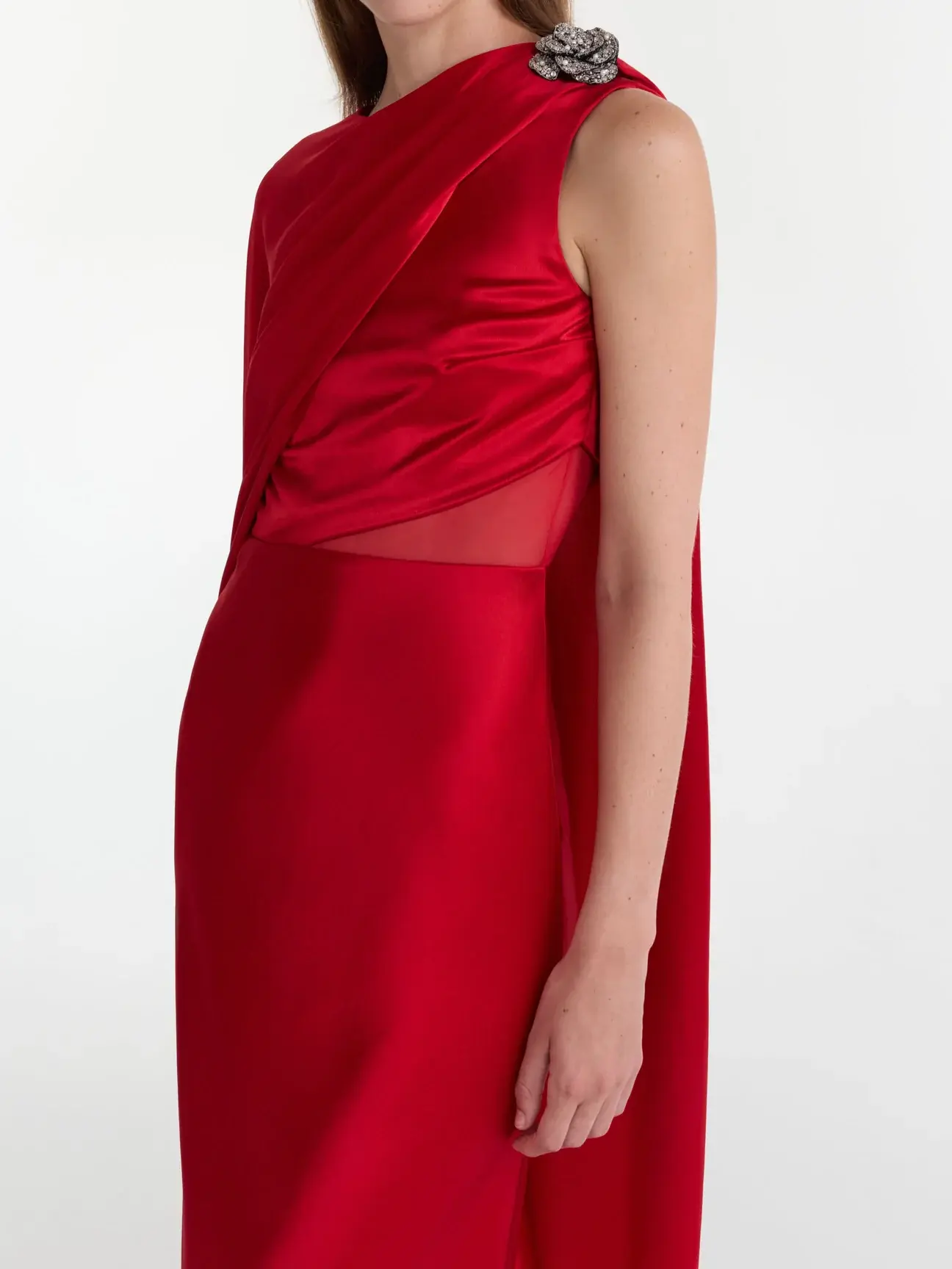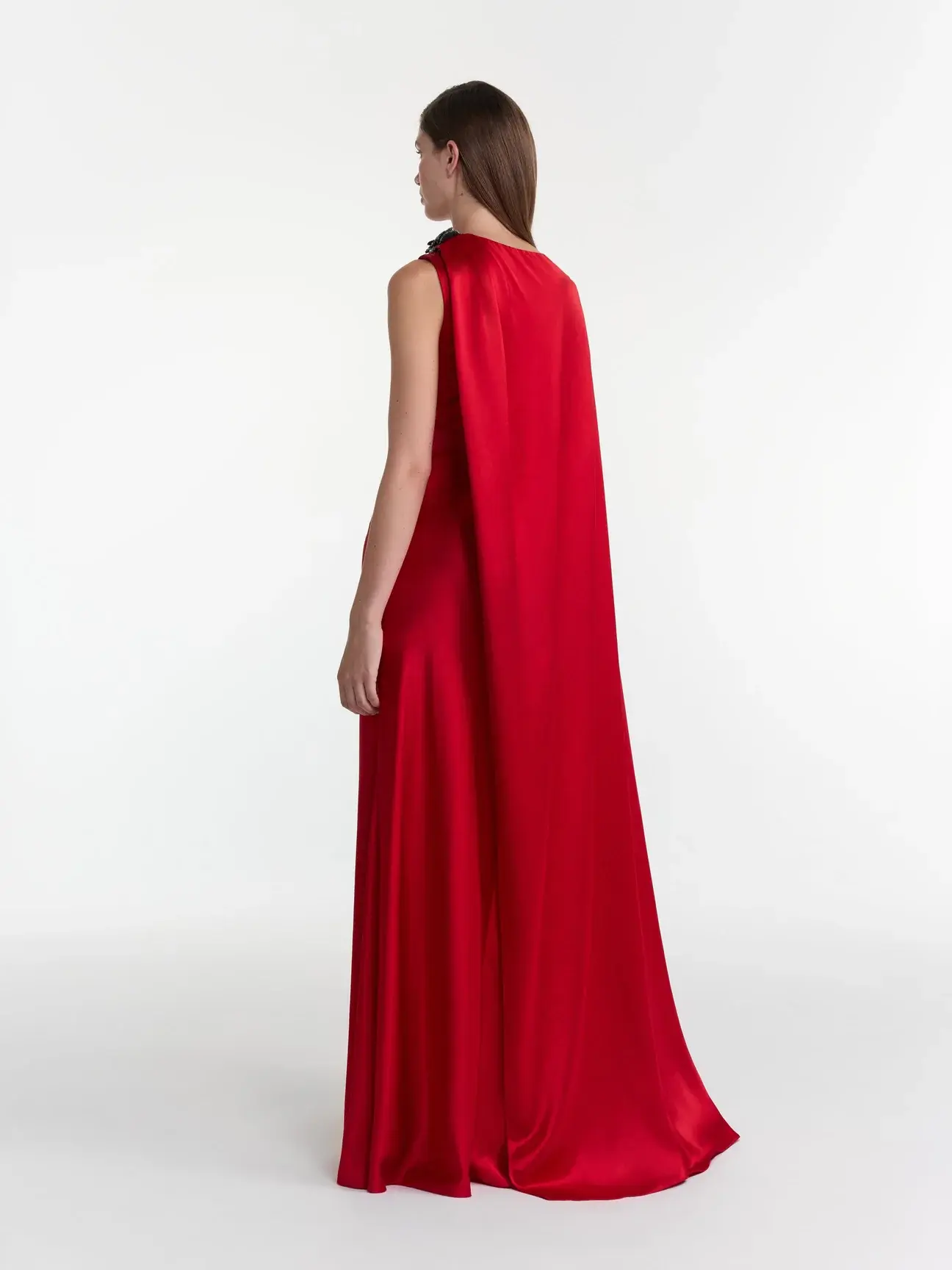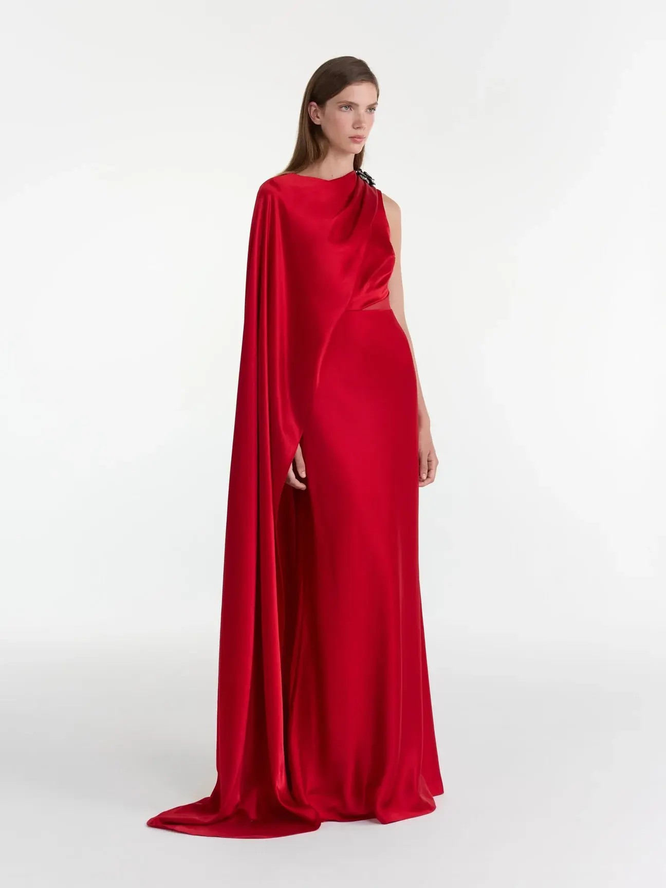 The Phoenix Long Dress features an asymmetric cape that cascades effortlessly over one shoulder. The rich satin fabric catches the light with every movement, while the bodice is beautifully draped, enhancing the fluidity of the design. Subtle accents of crystal rose embroidery add jewel-like sparkle. A striking blend of elegance and sophistication, this is a statement piece for black tie and formal events.