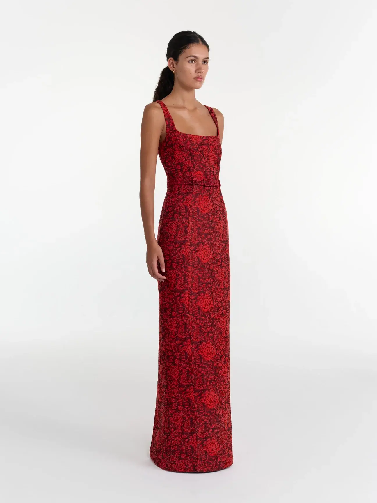 Embrace effortless elegance with the Bora Long Dress in Rose Brocade. Adorned with a timeless rose pattern, the rich brocade creates a tailored silhouette that flatters and defines the body. A matching belt cinches the waist, designed to balance modern structure with classic femininity. This maxi dress offers a chic and polished look for any special occasion.