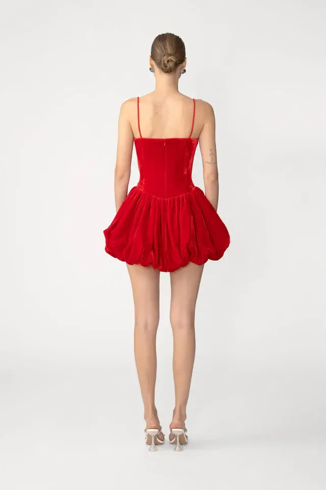 The Miley Dress is a modern ballerina mini, featuring a fitted corset bodice and a softly puffed bubble skirt. Crafted in velvet with hand-tied pipa knots along the front, its clean lines and controlled volume create a playful yet polished silhouette.