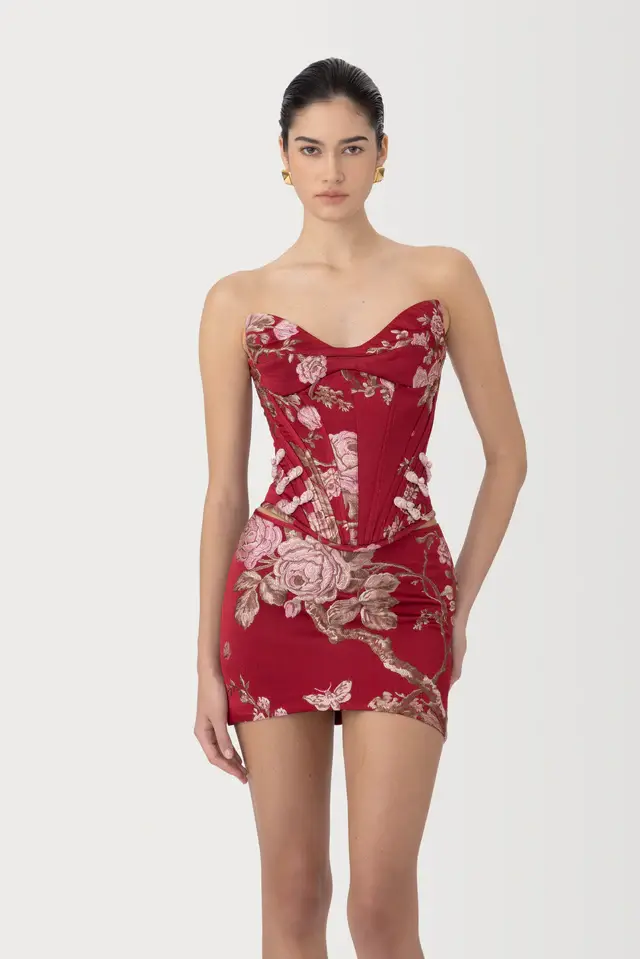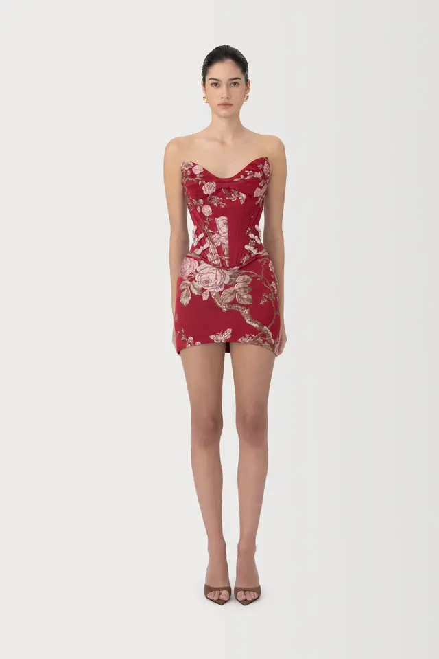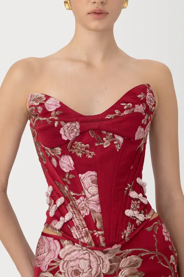 The Nico top is a strapless design in exquisite peony inspired brocade. Its sweetheart neckline frames the shoulders, while the bustier bodice offers support and a modern silhouette. Satin hand-tied pipa button details deliver a refined finish, creating a perfect pairing with the matching Nico skirt.