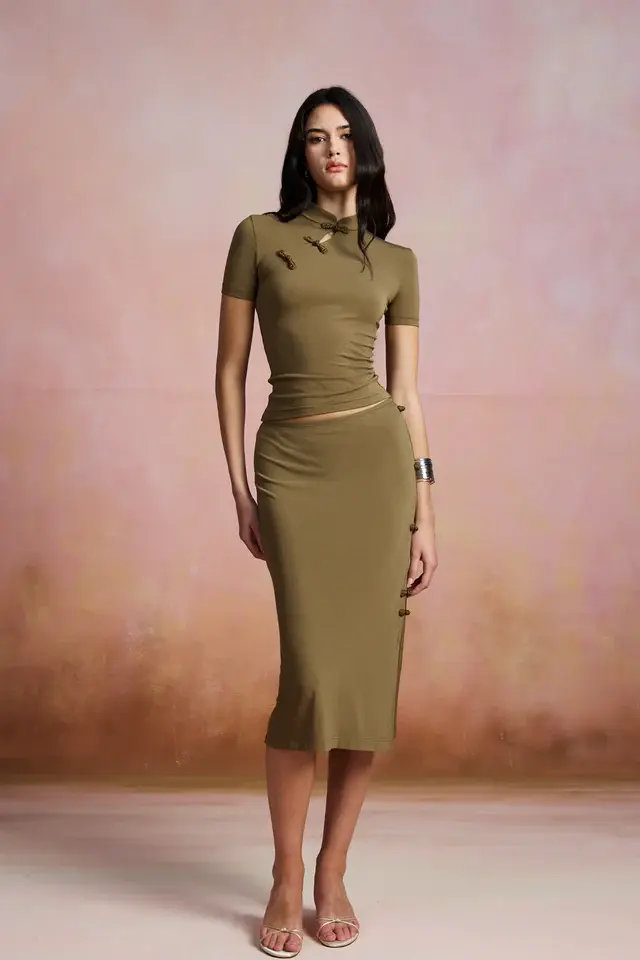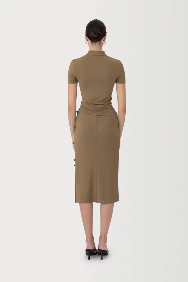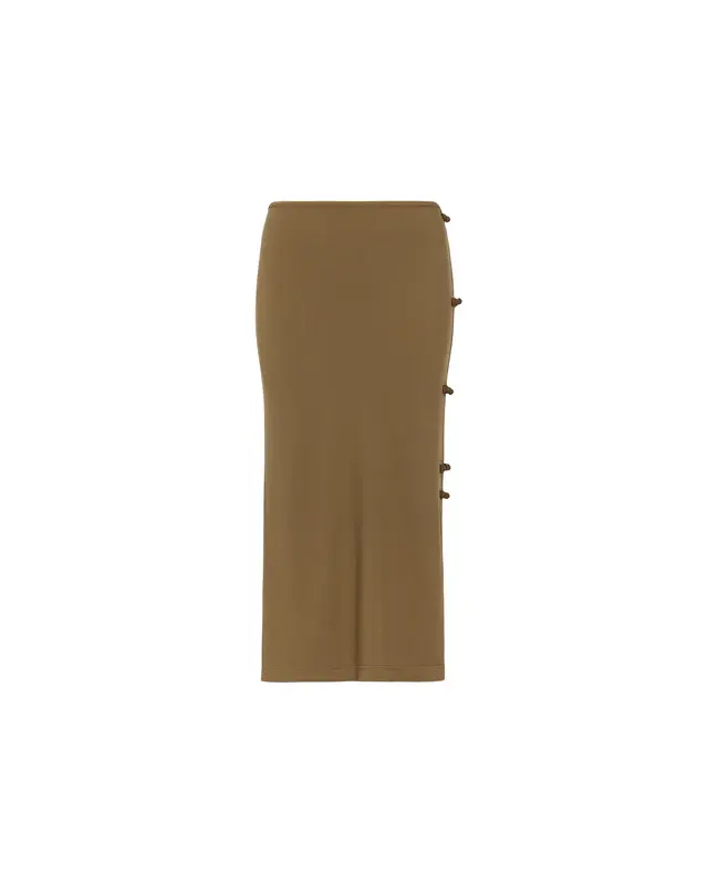 The Timo skirt is designed in a midi length for everyday wear. Cut from a soft viscose jersey, in bias-cut, this mid-rise skirt drapes effortlessly for a flattering fit. Hand-tied pipa knot details provide a unique accent, creating a perfect pairing with the Timo jersey top.
