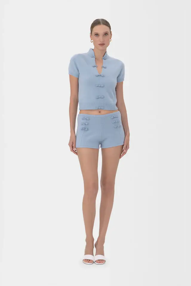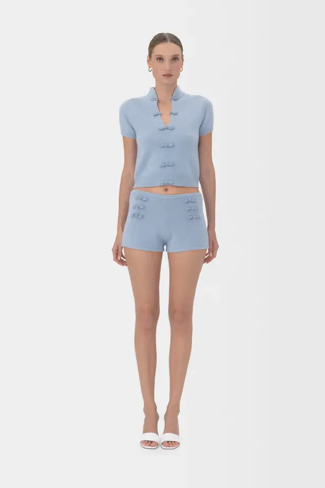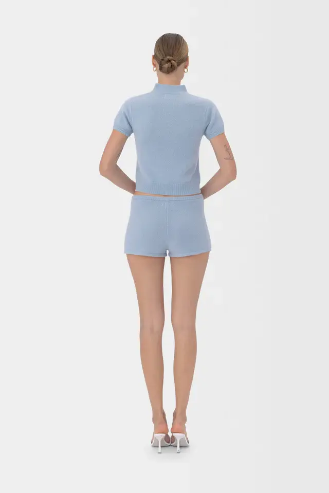 The Aspen cashmere top is crafted from luxuriously soft cashmere, this knitted short-sleeve top is a modern wardrobe essential. It features refined satin hand-tied pipa knot details and is finished with clean ribbed cuffs and hem. Pairs seamlessly with Aspen cashmere shorts to create a sophisticated full cashmere look.