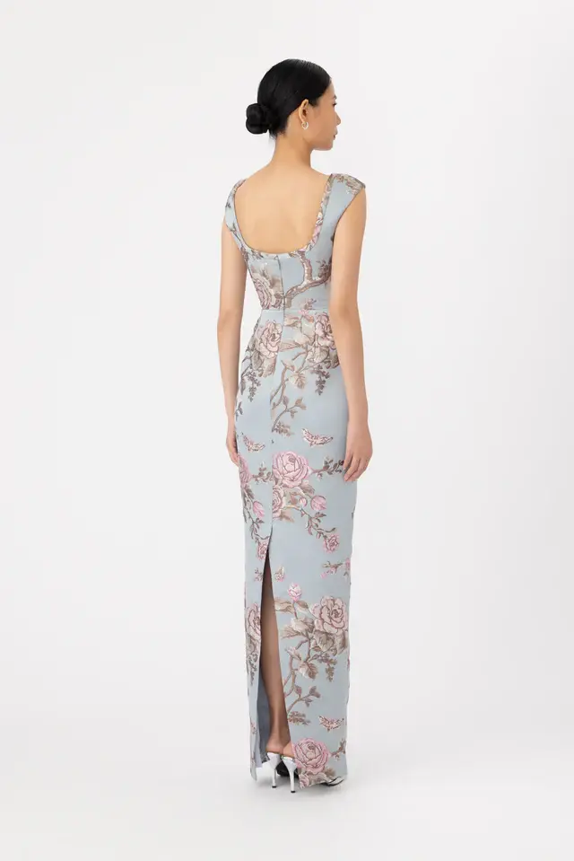 The Brooke brocade gown is a floor-length design in luxurious peony brocade fabric. It features a scoop neckline and a built-in structured corset for a sculpted fit. A front curved waistline defines the silhouette, while a back slit completes the sophisticated look.