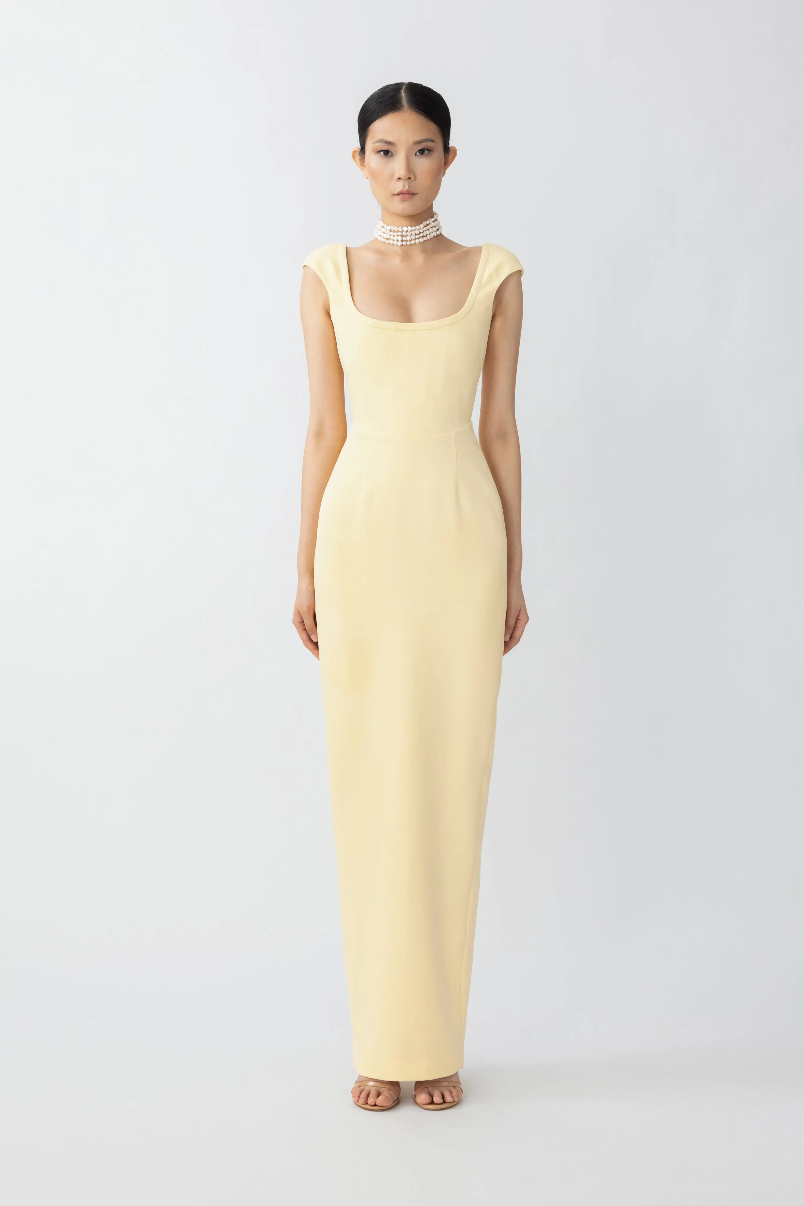 Crepe fitted gown with a scoop neckline and slight cap sleeves