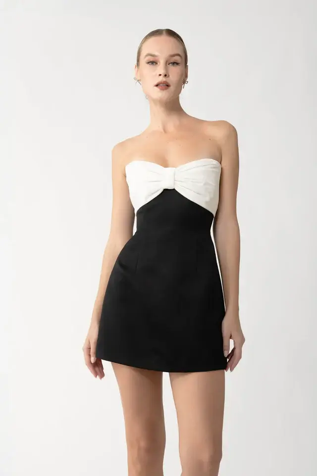 The Jace Dress is a satin mini cut with a clean A-line shape and finished with a contrast velvet bow. A playful take on classic evening dressing.
