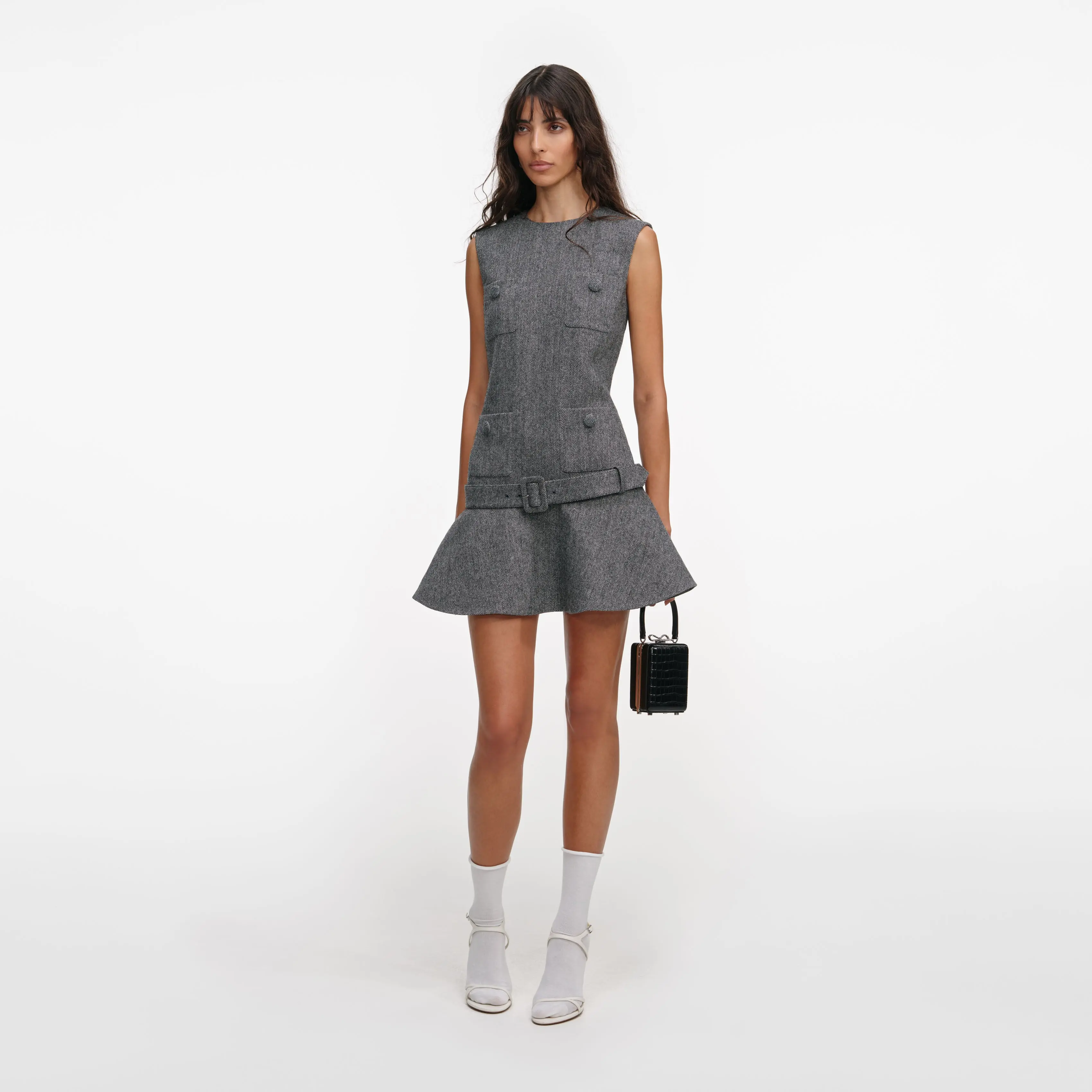 A statement belt accentuates the stylish drop-waist silhouette and flirty flared skirt of this herringbone wool mini dress. Front pockets lend extra design detail – wear with flats and heels alike.