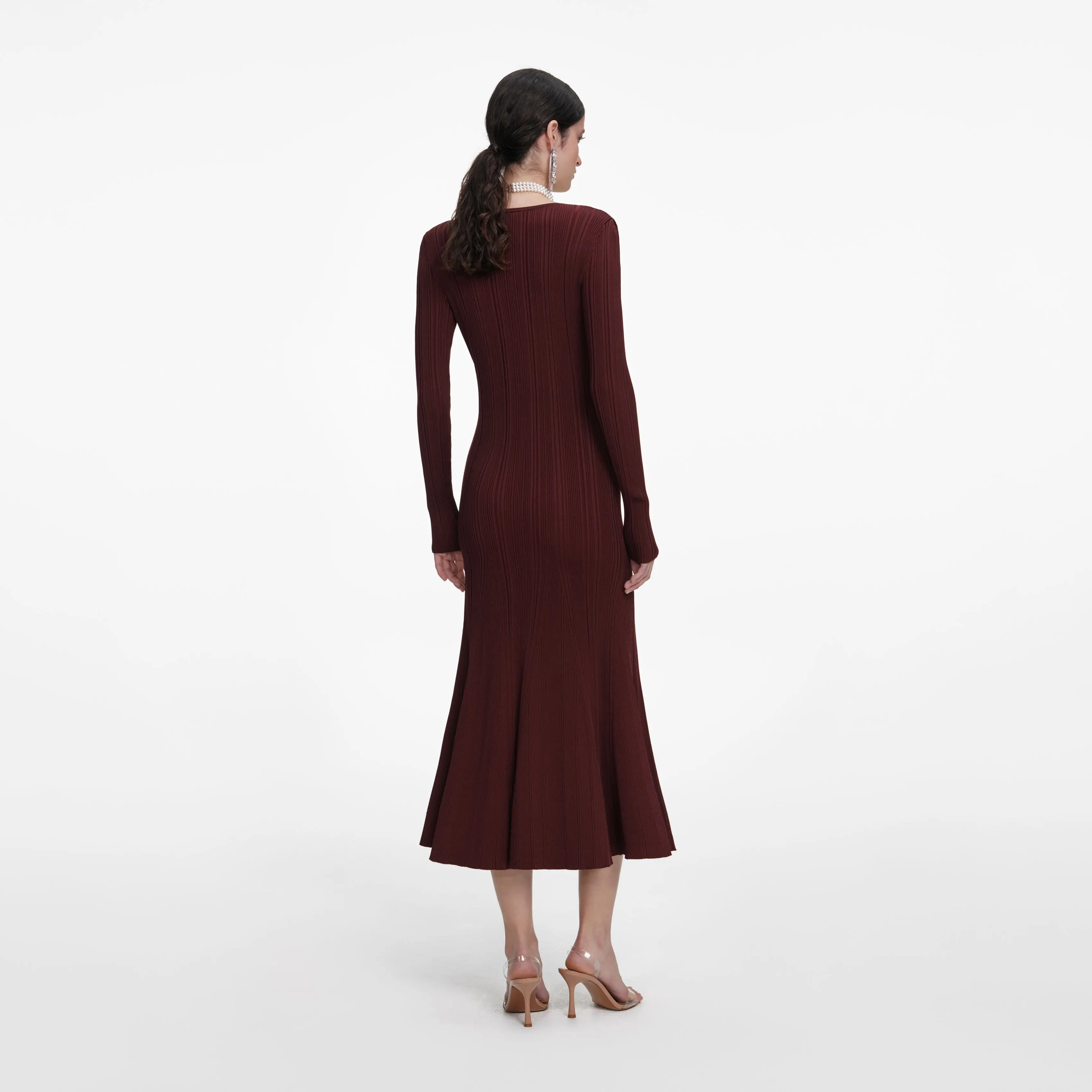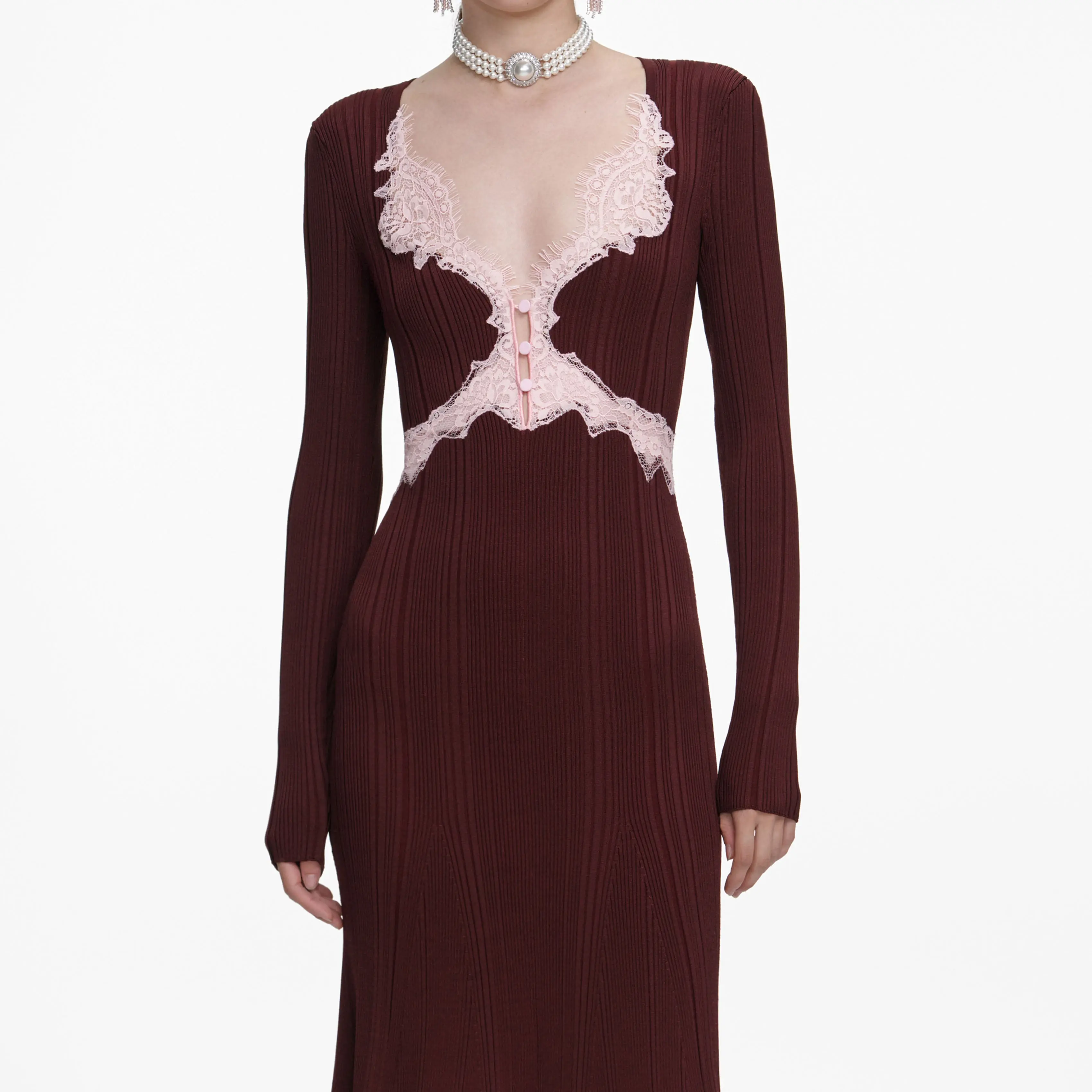 Pretty in pink, contrast lace trims add lingerie-inspired detail to this brown knit midi dress. Pair its fit-and-flare hem with flats for birthday lunches or add heels for a night at the opera.