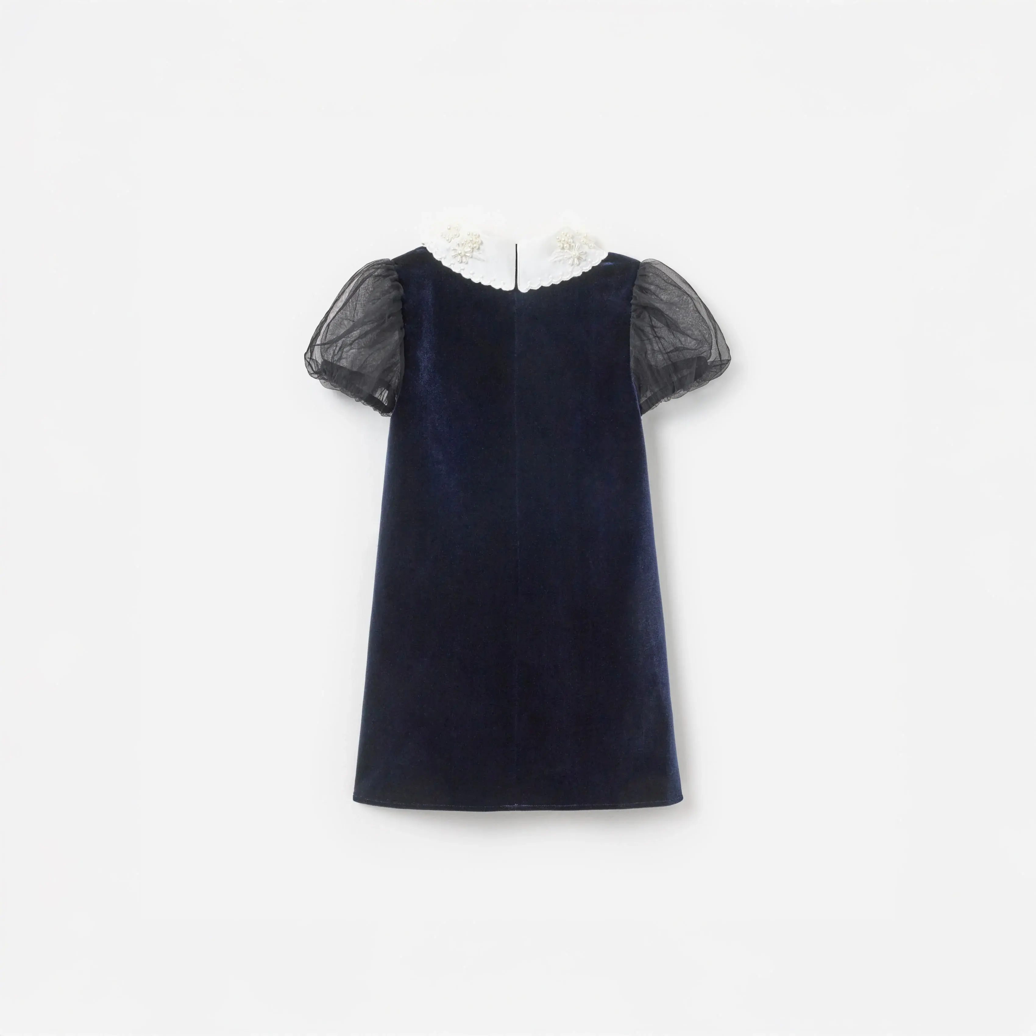 The pearl-topped contrast collar frames this velvet mini dress to delightful effect. A bow motif and sheer balloon sleeves lend extra charm – style with Mary Janes for parties and play dates alike.