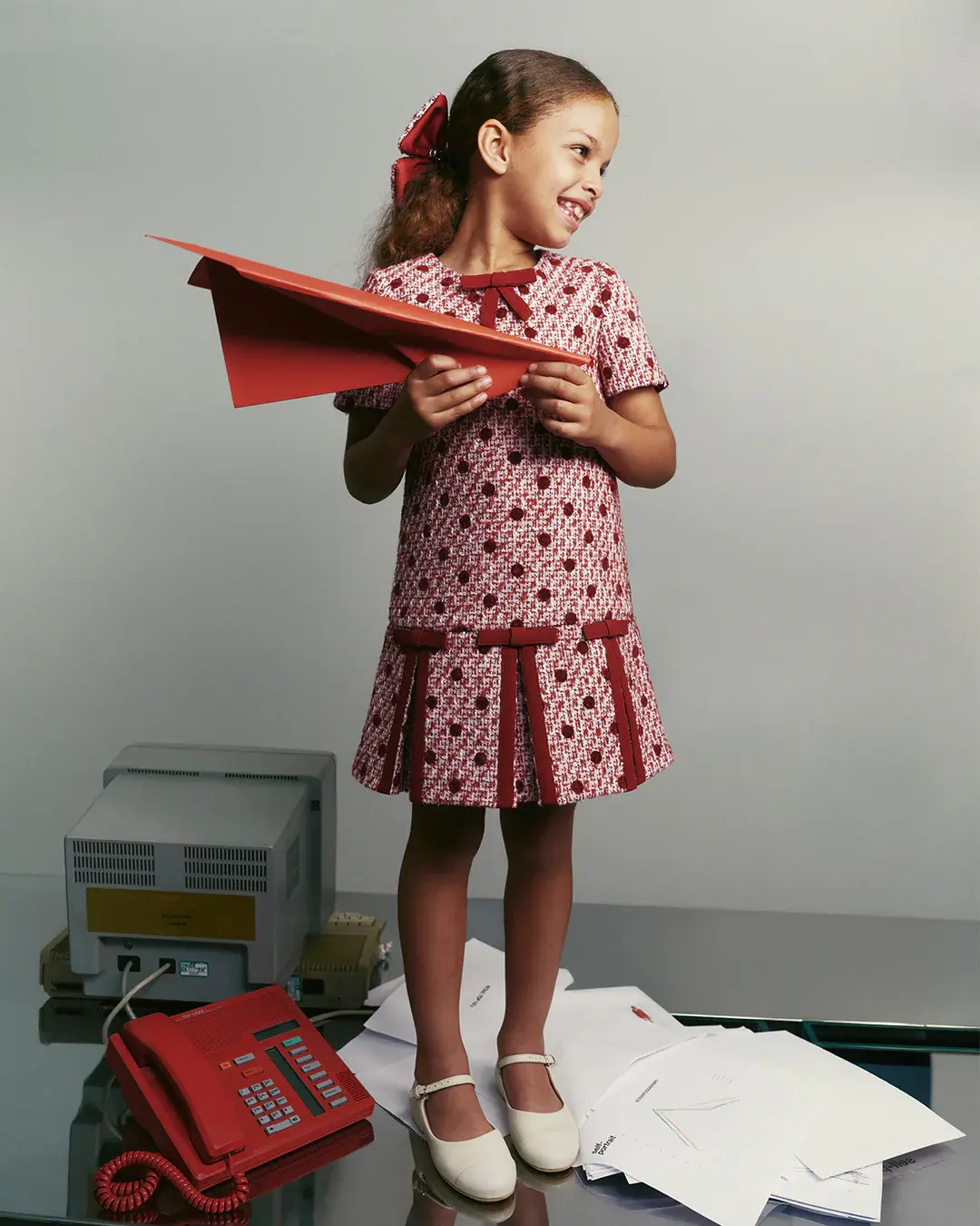 Playful polka dot meets the soft structure of burgundy bouclé in this relaxed fit dress. Bow motifs and velvet trims add extra charming detail – style with Mary Janes for a ritzy afternoon tea.