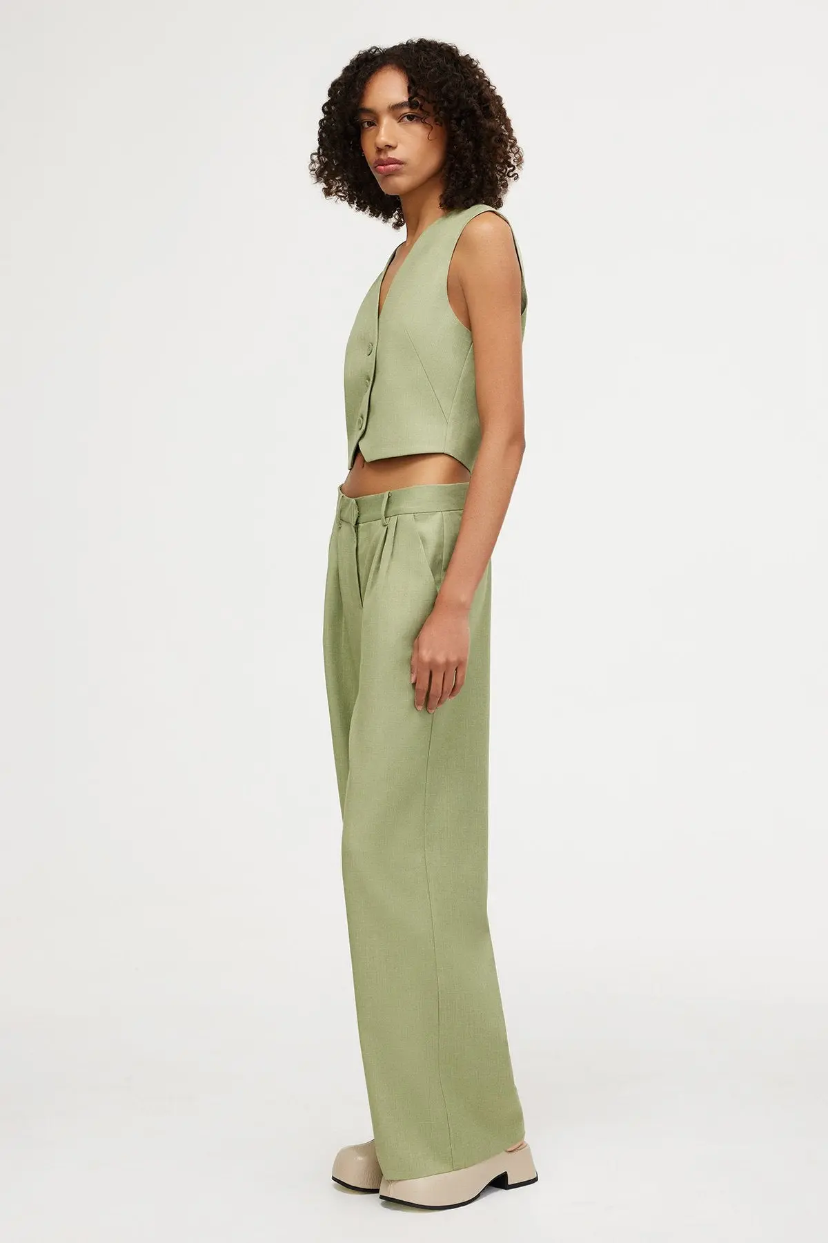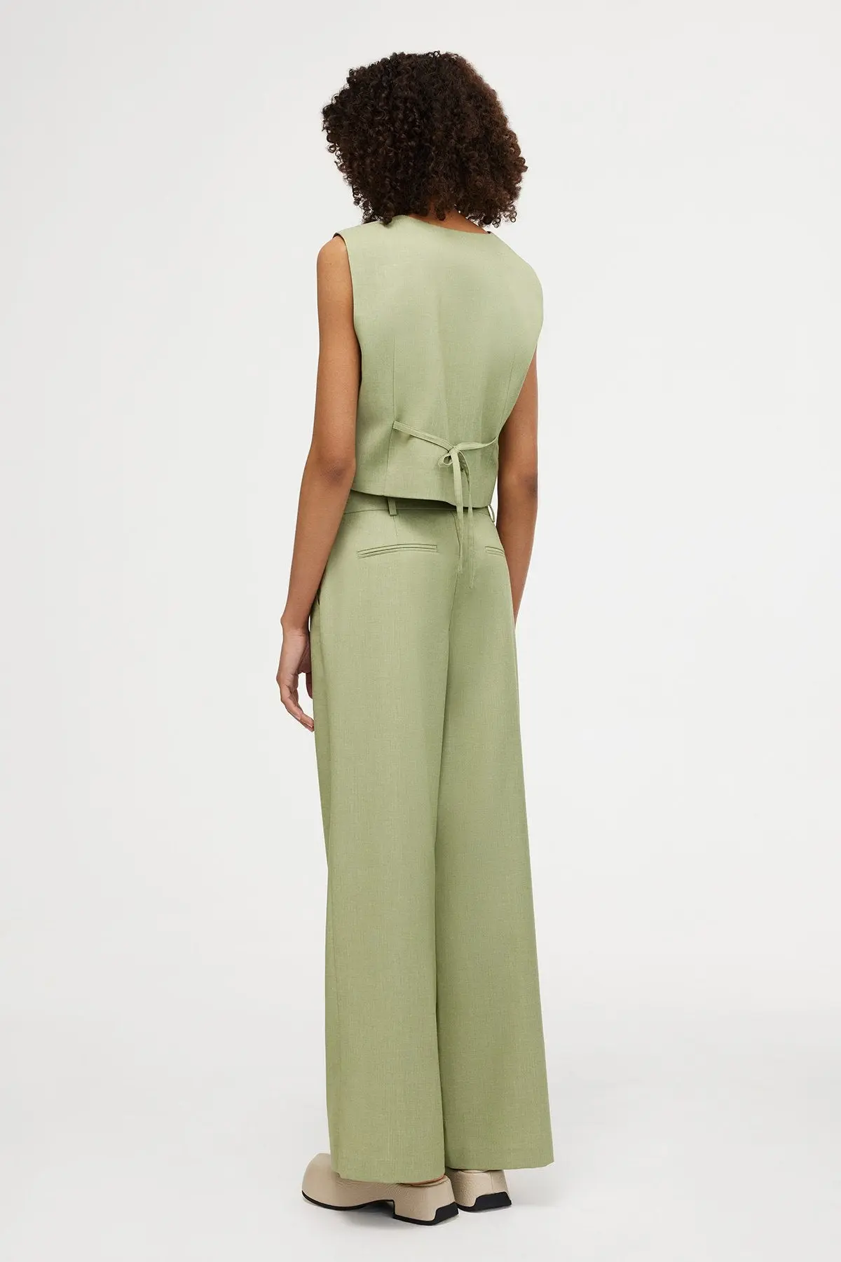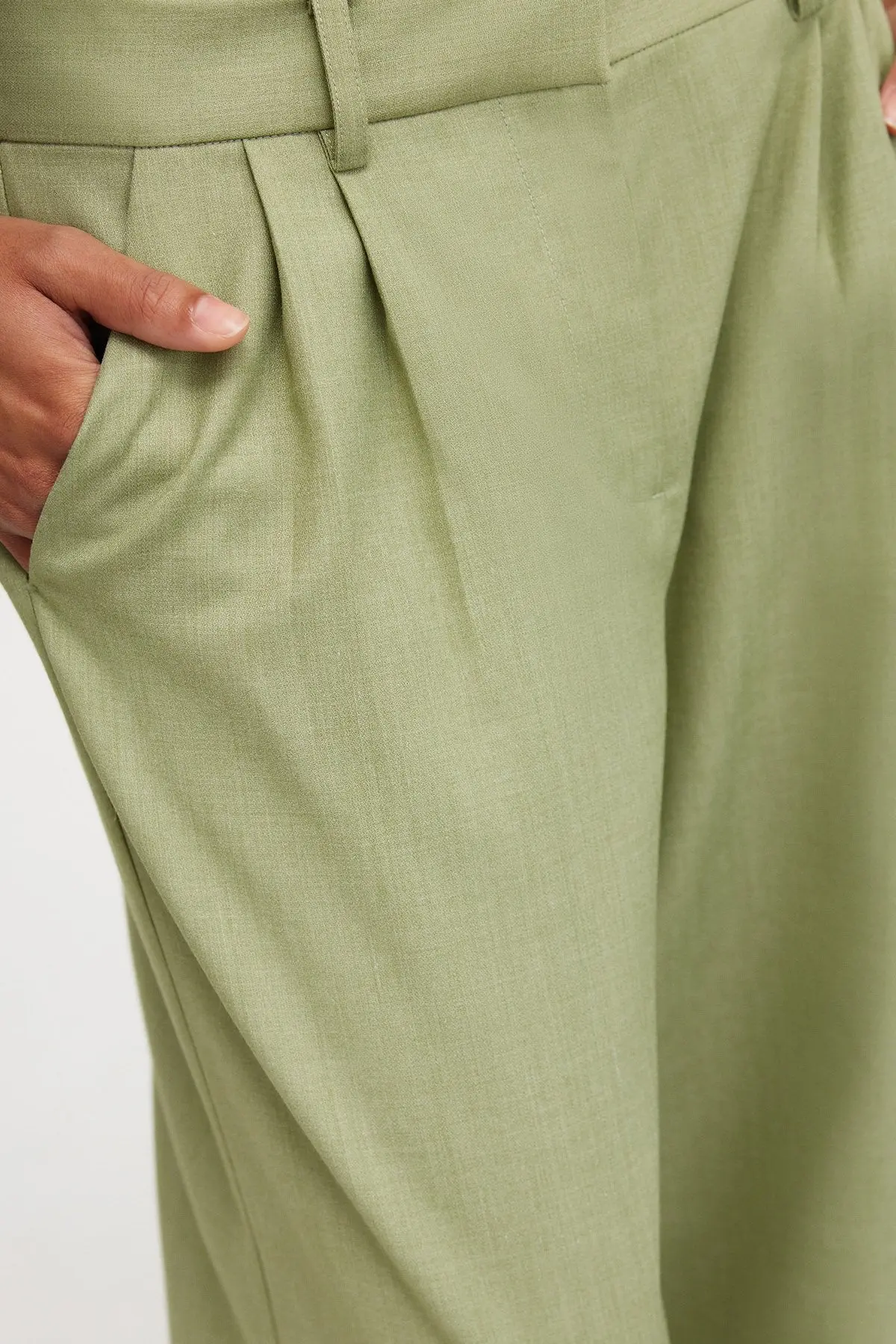 Designed to be fitted at the waist and relaxed toward the hem, the Leighton Pant in Sage are an easy wear silhouette. Designed to sit below the waist, featuring subtle twin pleats, back faux pockets, front fly closure and belt loops. - Full length pant - Lightweight fabric - Unlined - Front zipper opening