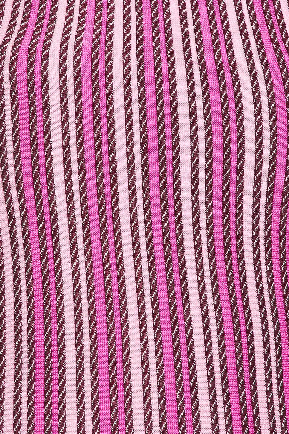 The Soliel Dress in Kiwi Multi. Crafted from striped compact fabric, this strapless midi features a sculpted bodice and a flowing silhouette.