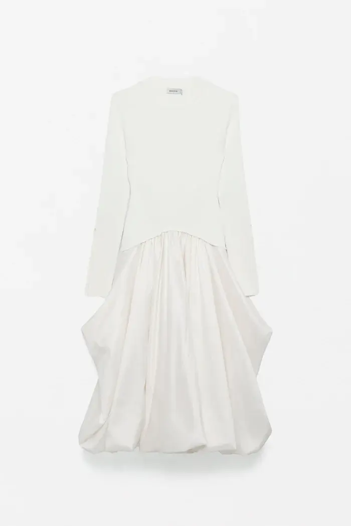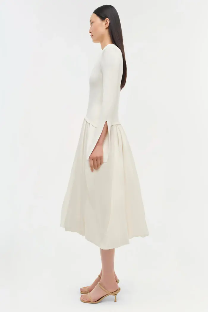 The Kenlie Dress in Ivory. Meticulously crafted mock neck midi featuring form-fitting long sleeves with artful side cuts. Sculpted bodice transitions to a voluminous skirt, blending poise with a hint of playful drama.