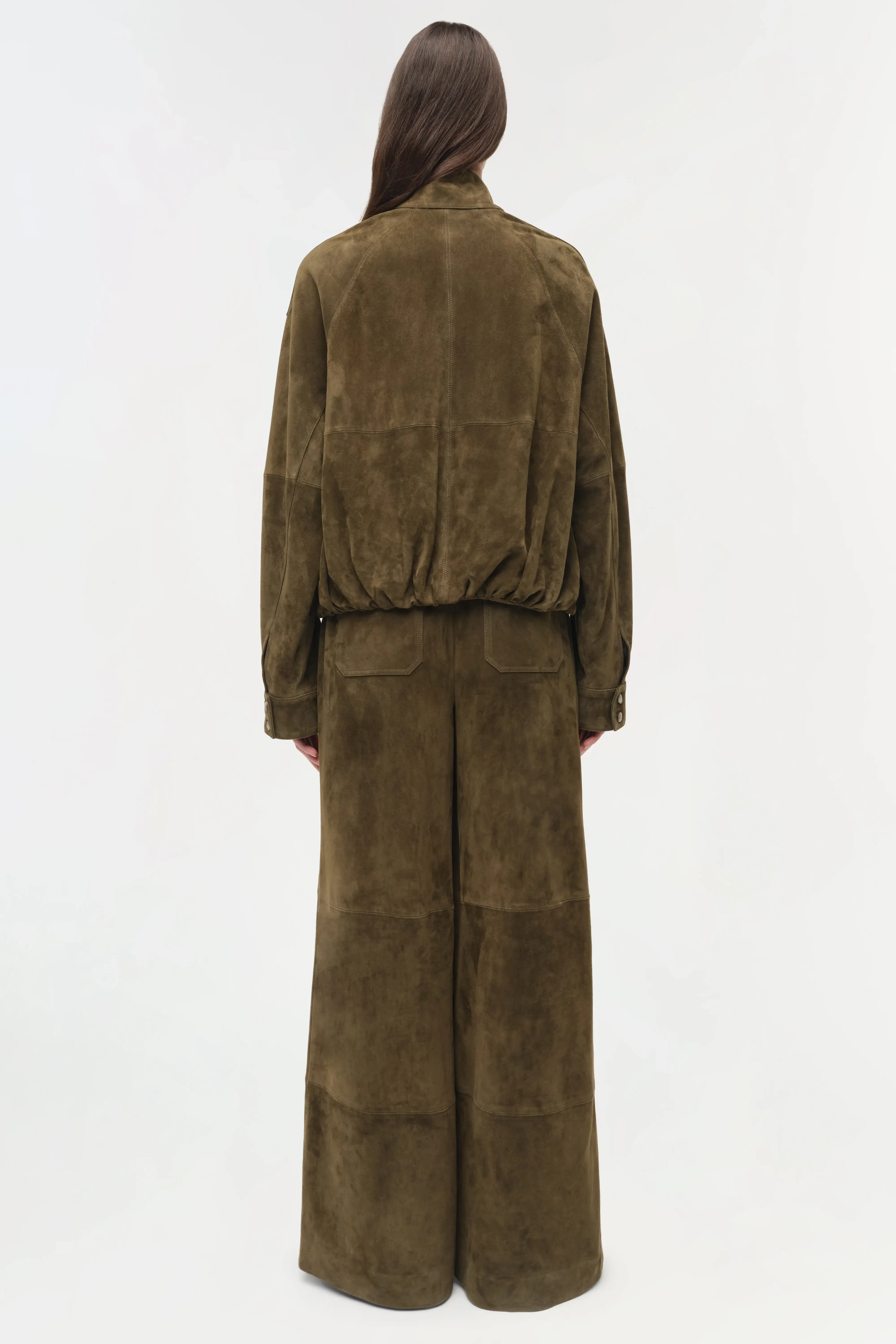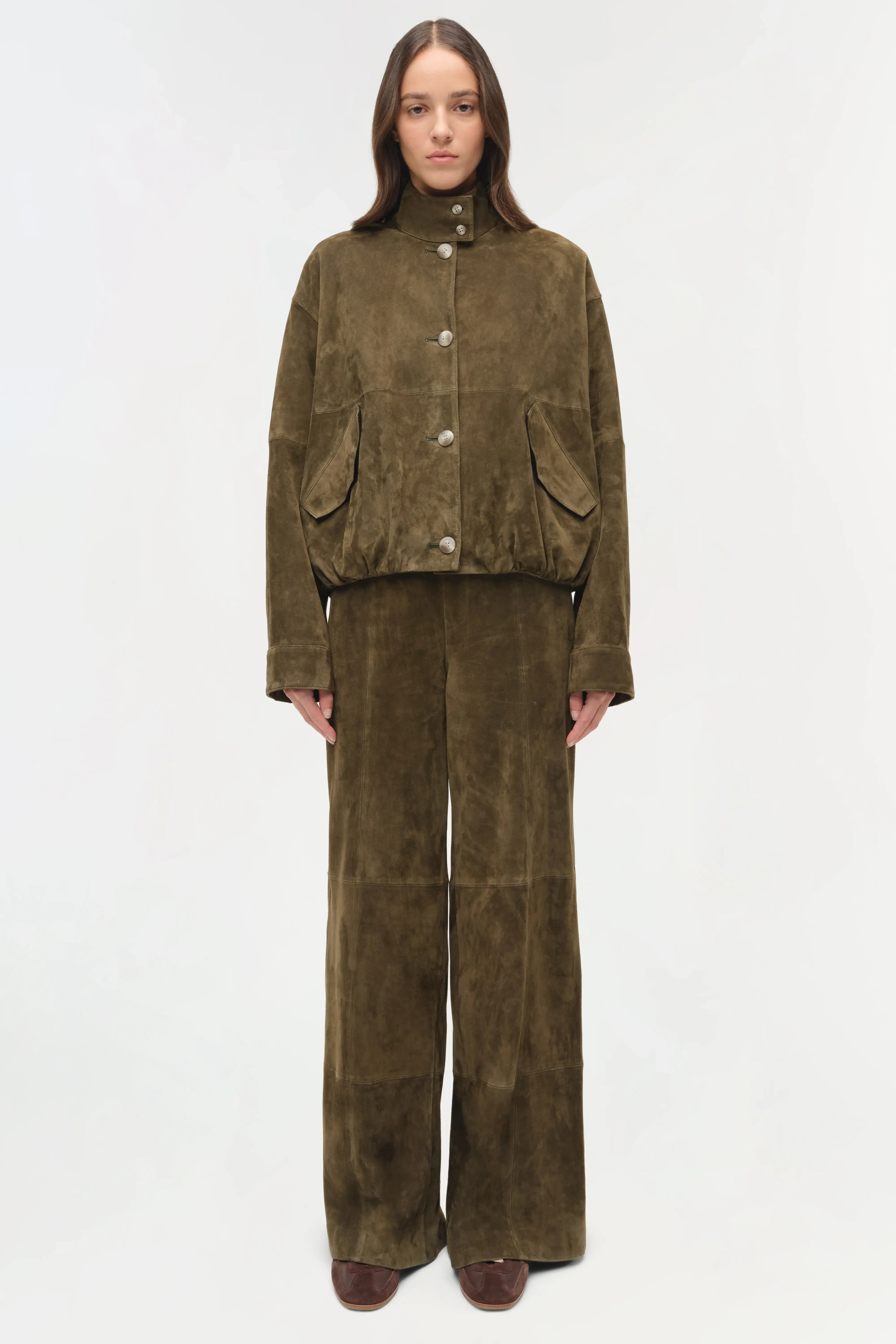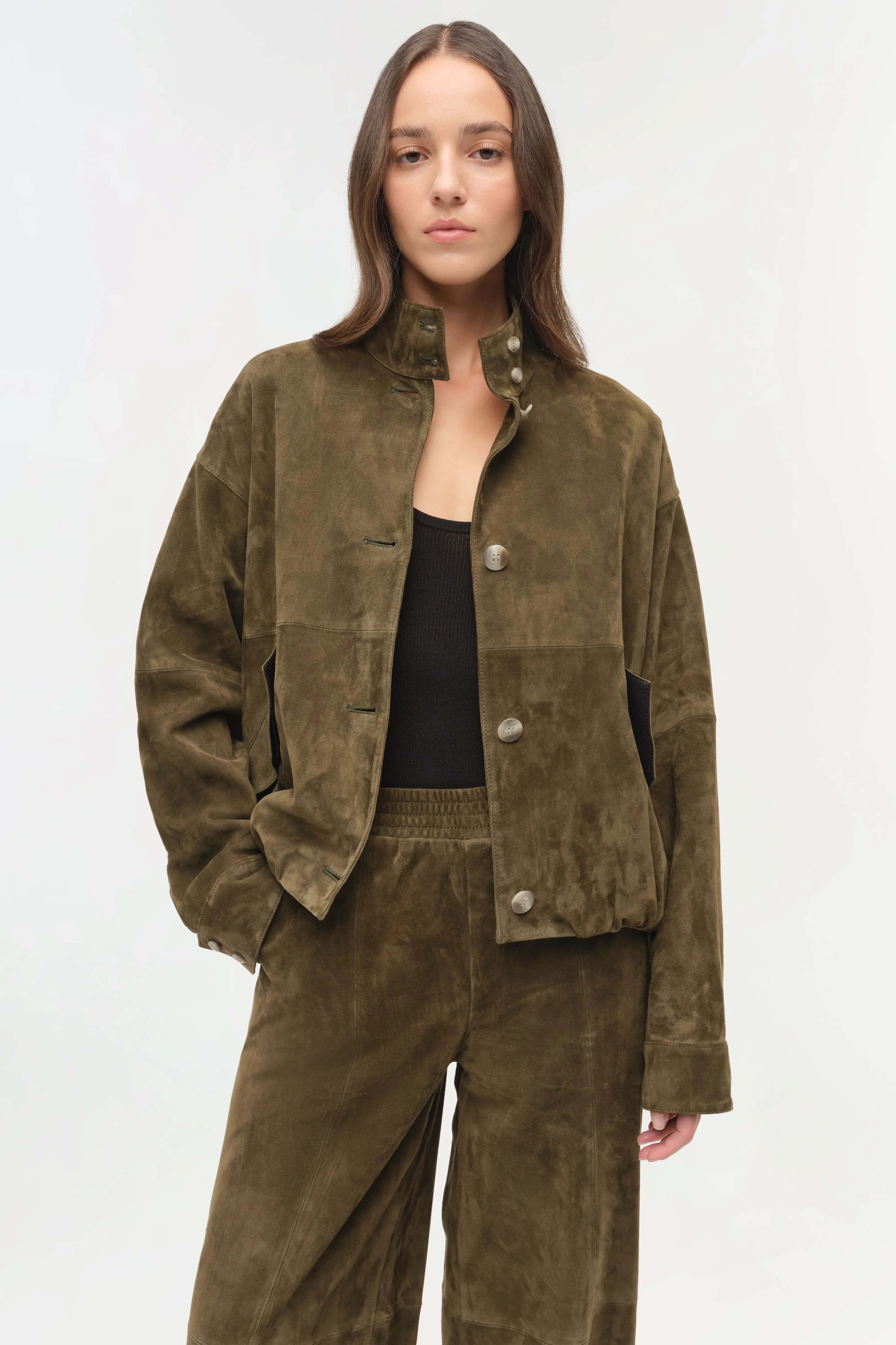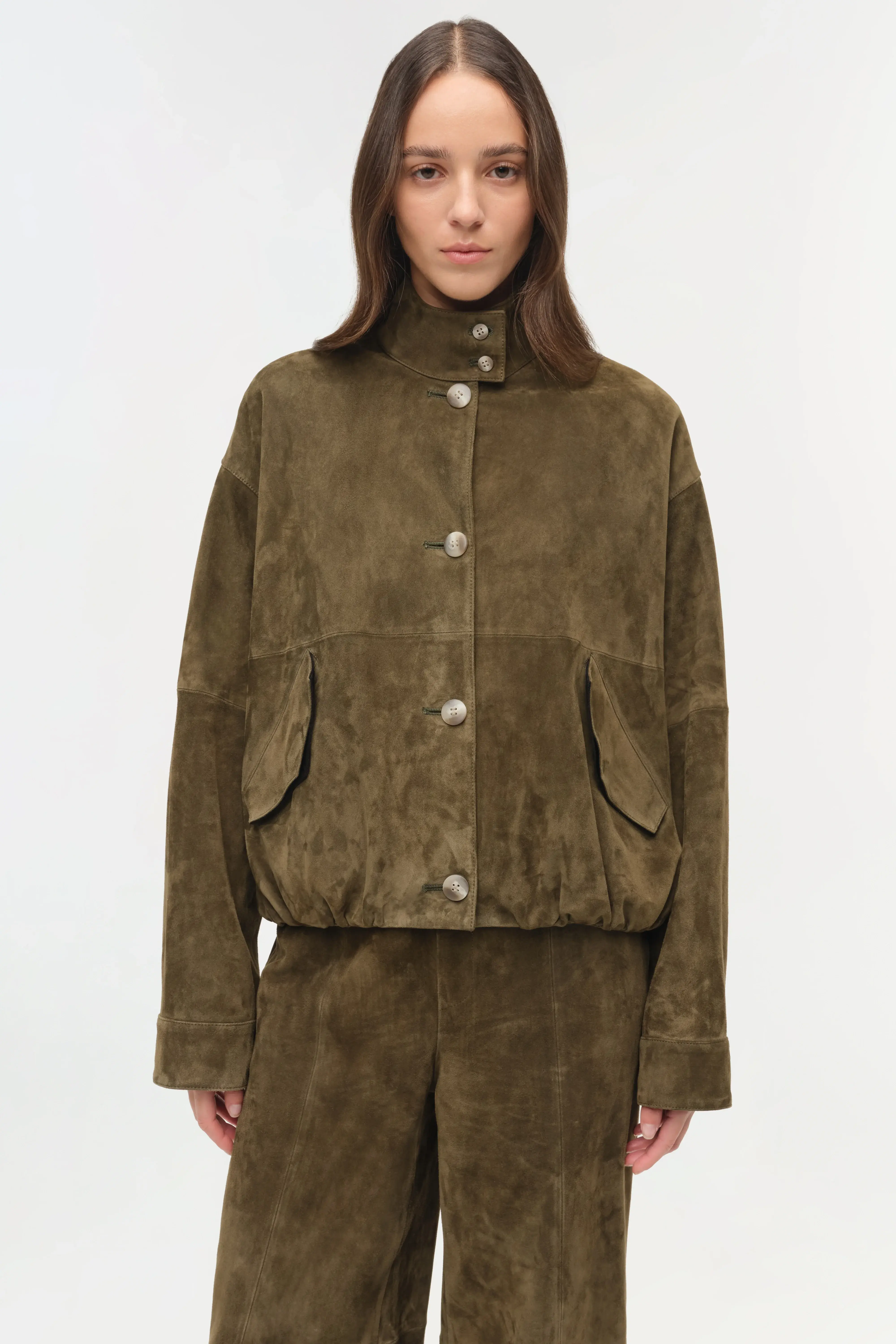 Crafted of soft suede, the Marley jacket from SIMKHAI features a blouson bodice. A stand collar and side flap pockets complete the look.