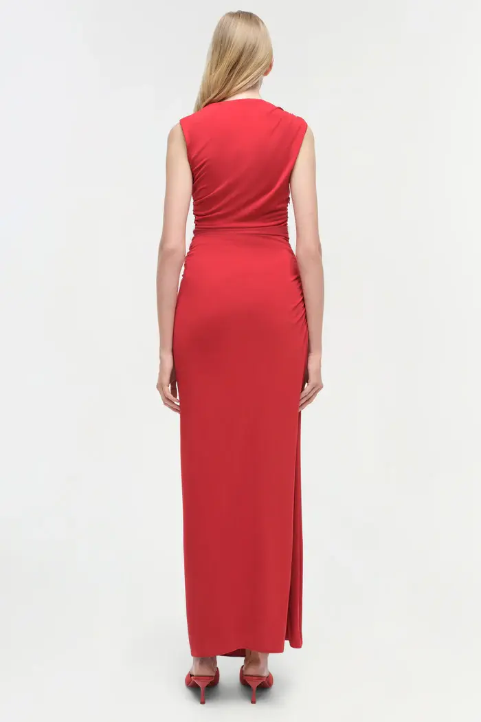 A mock neck gown that flatters the form in fluid jersey that is intentionally gathered at the hips. Sleeveless, hardware detail, front slit.