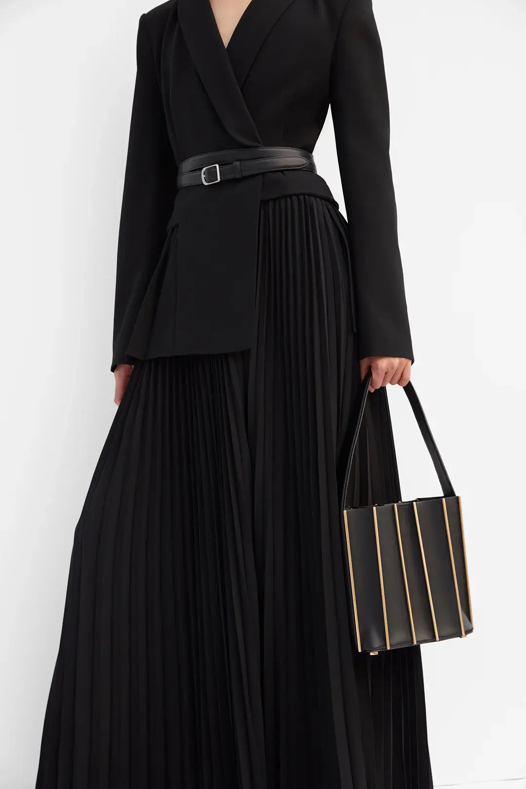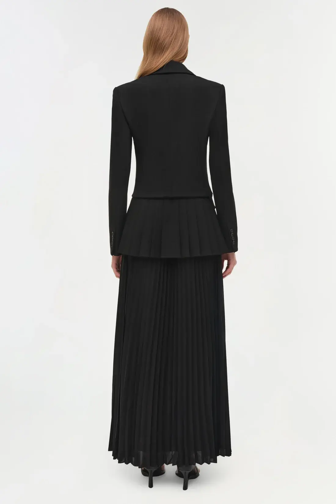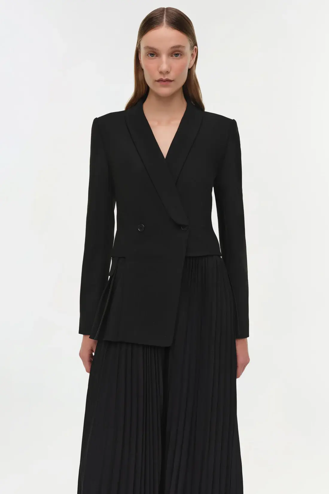 Cut from structured suiting, this dress combines a tailored double-breasted bodice with a finely pleated midi skirt, blending precision with fluid ease. A polished, versatile silhouette that carries effortlessly from day to evening.