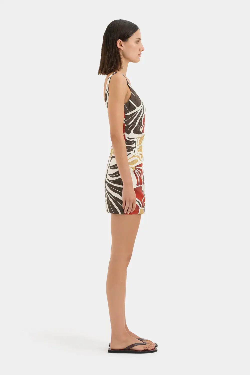 Mini length Square neckline Wide straps Tucks through body Gathers through the side waist Invisible zipper at side Side split Fully lined Midweight natural fibre linen with luxurious hand feel Exclusive SIR. print No stretch True to size