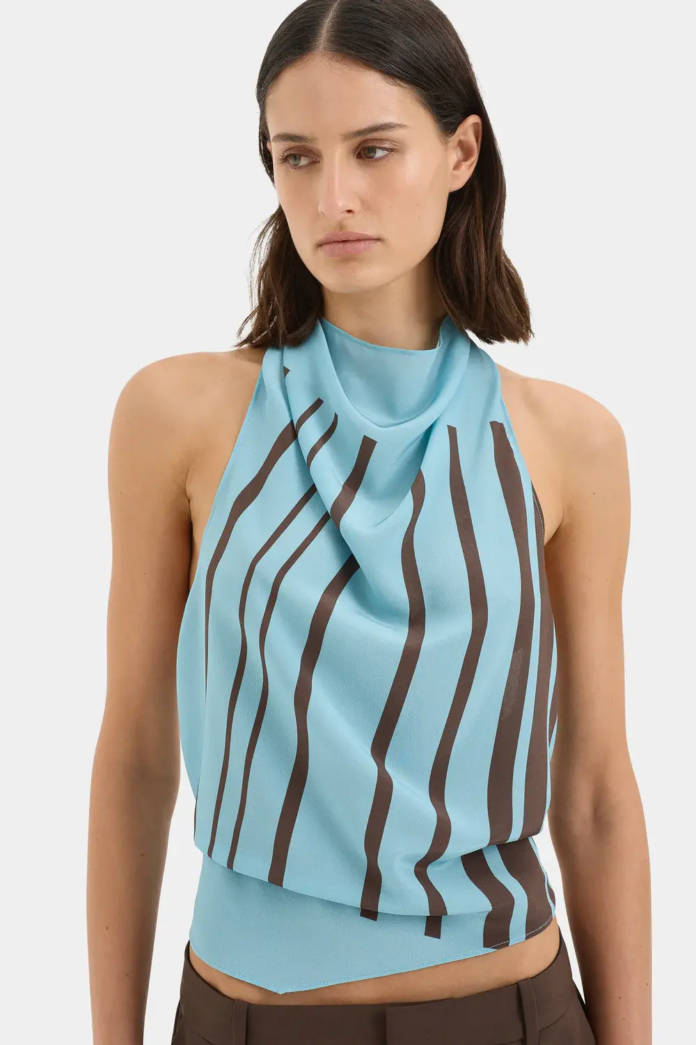 Scarf top Halter neck Removable bead detail Adjustable through back neck and waist tie Silk fabrication with matte crepe finish and opaque look Exclusive SIR. print engineered to garment No stretch True to size