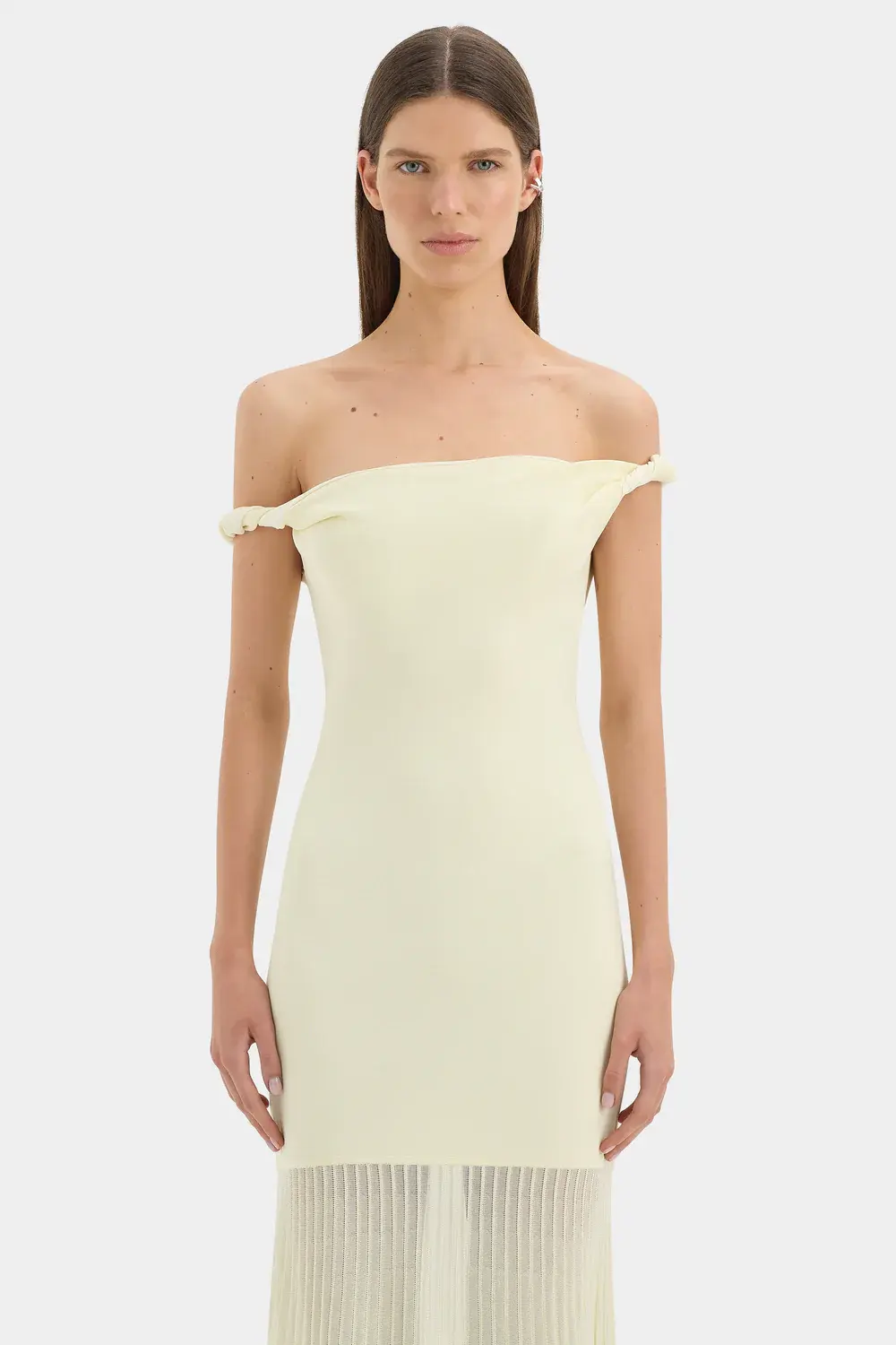 Full length Off shoulder Twist detail at straps Contrast double layer through body Sheer pleated full skirt Midweight compact knit Generous stretch True to size