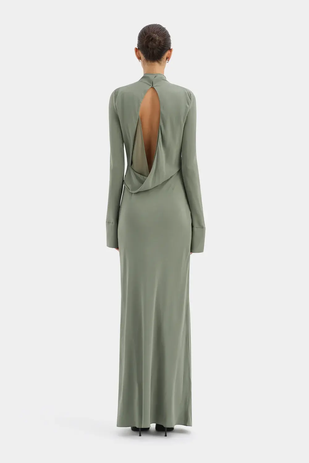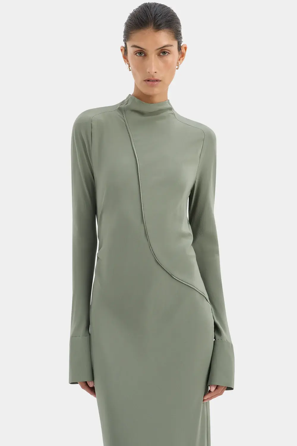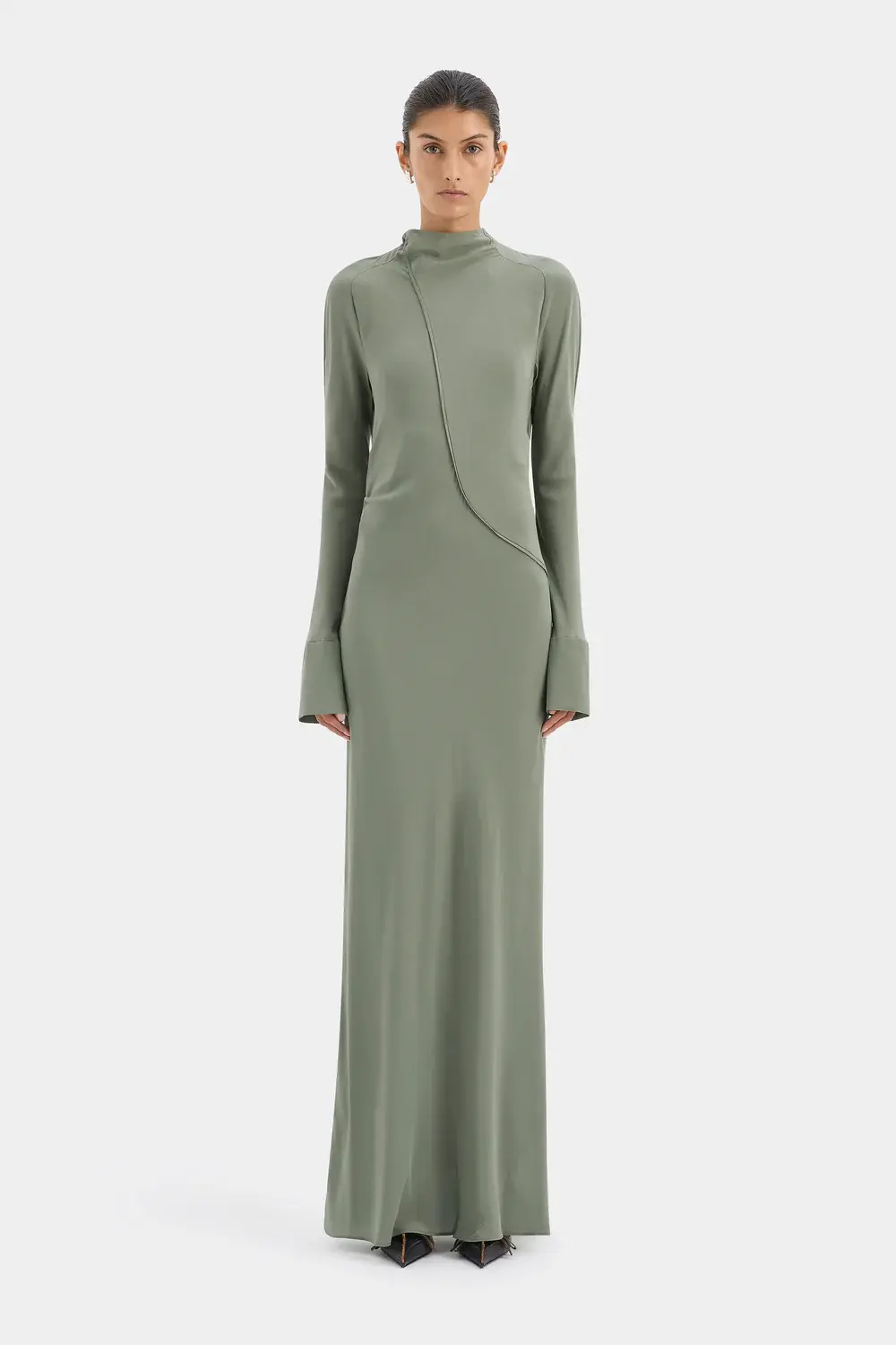 Draped neckline Panelling detailing Long sleeve Full length Breathable lightweight silk crepe fabrication with matte finish No stretch True to size