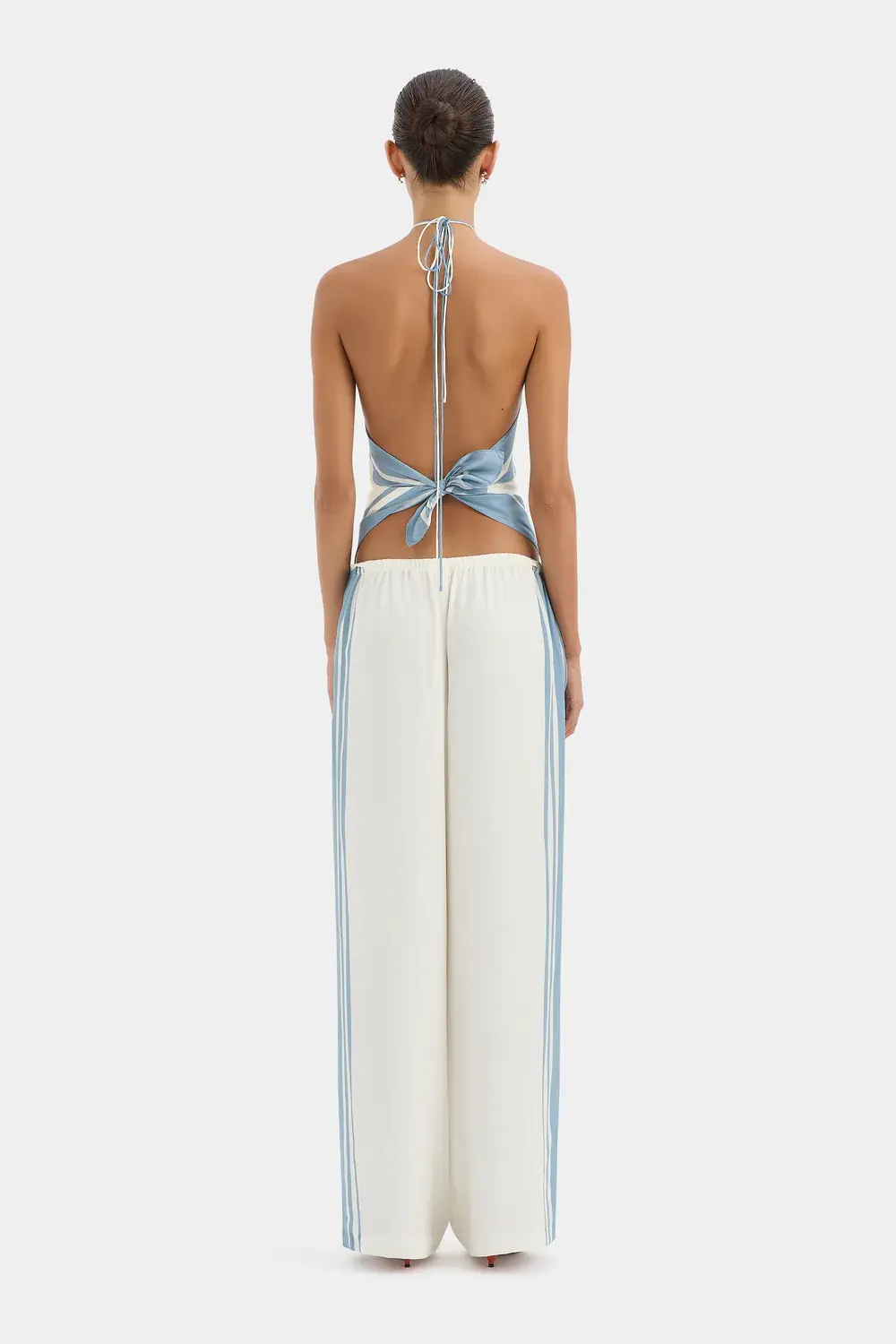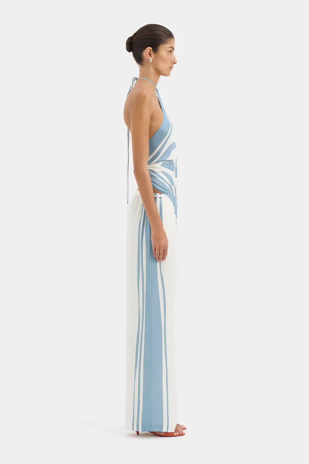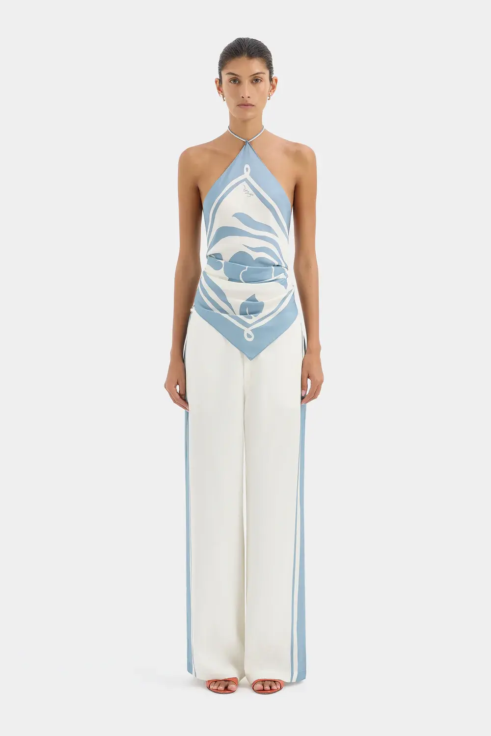 The Lilou Drawstring Pant in Liora Blue is crafted from lightweight silk in an exclusive SIR. print. Designed to sit mid-rise, it features a wide leg silhouette, elastic waistband and drawstring for an adjustable fit.