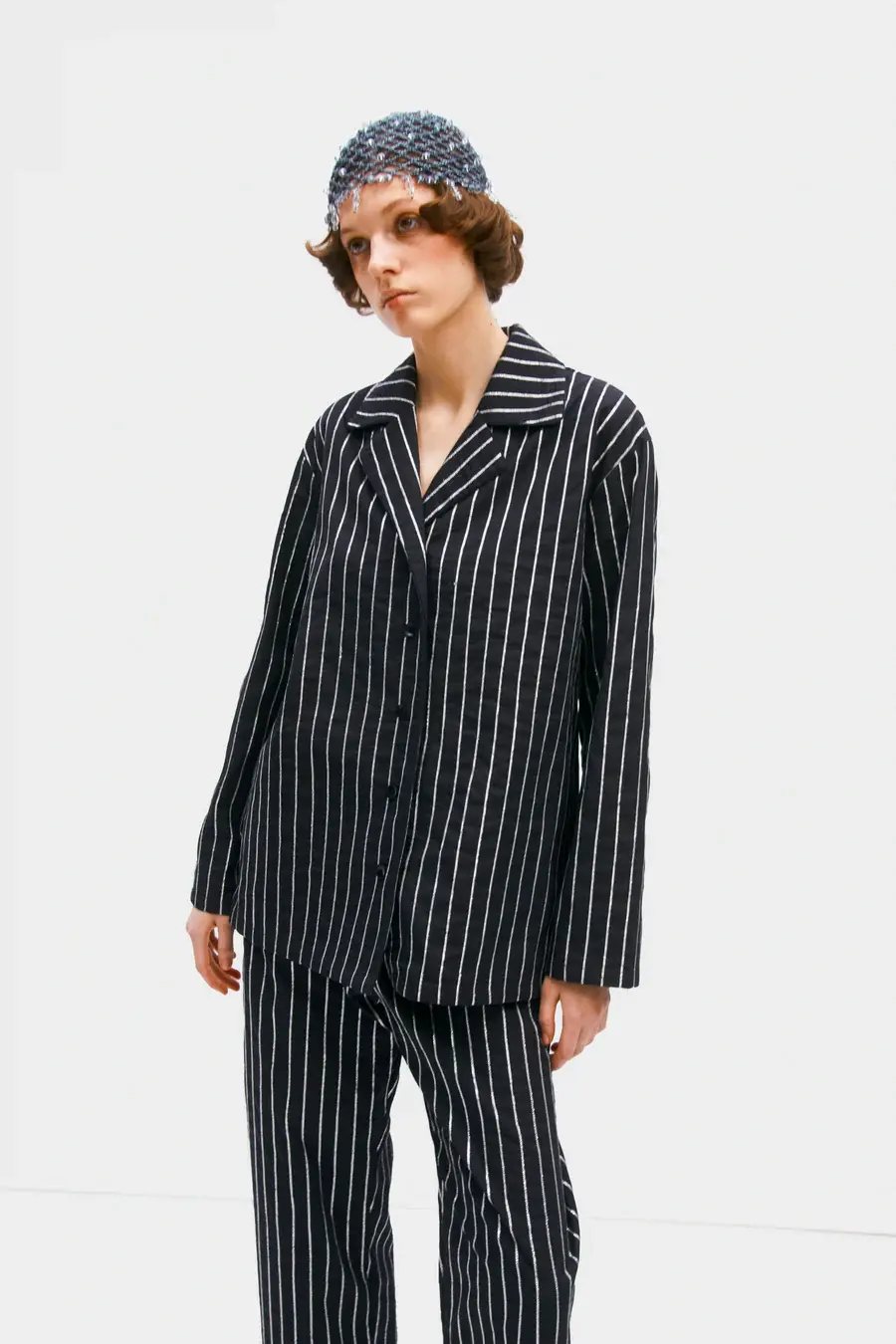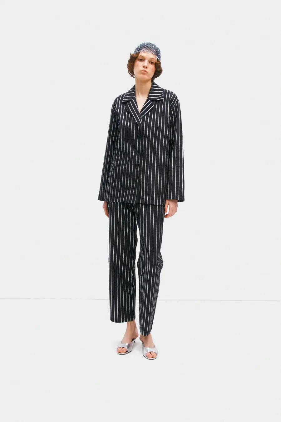 This Sequined Cotton Pajama Set in black features a classic silhouette crafted from organic-cotton poplin, featuring a crisp texture that exudes refinement. Enhanced with lurex threads, this set adds a subtle sparkle, making it an excellent choice for both relaxed evenings and black tie events. This set can be effortlessly paired with heels to achieve a sophisticated ensemble.