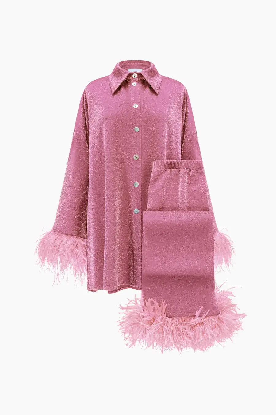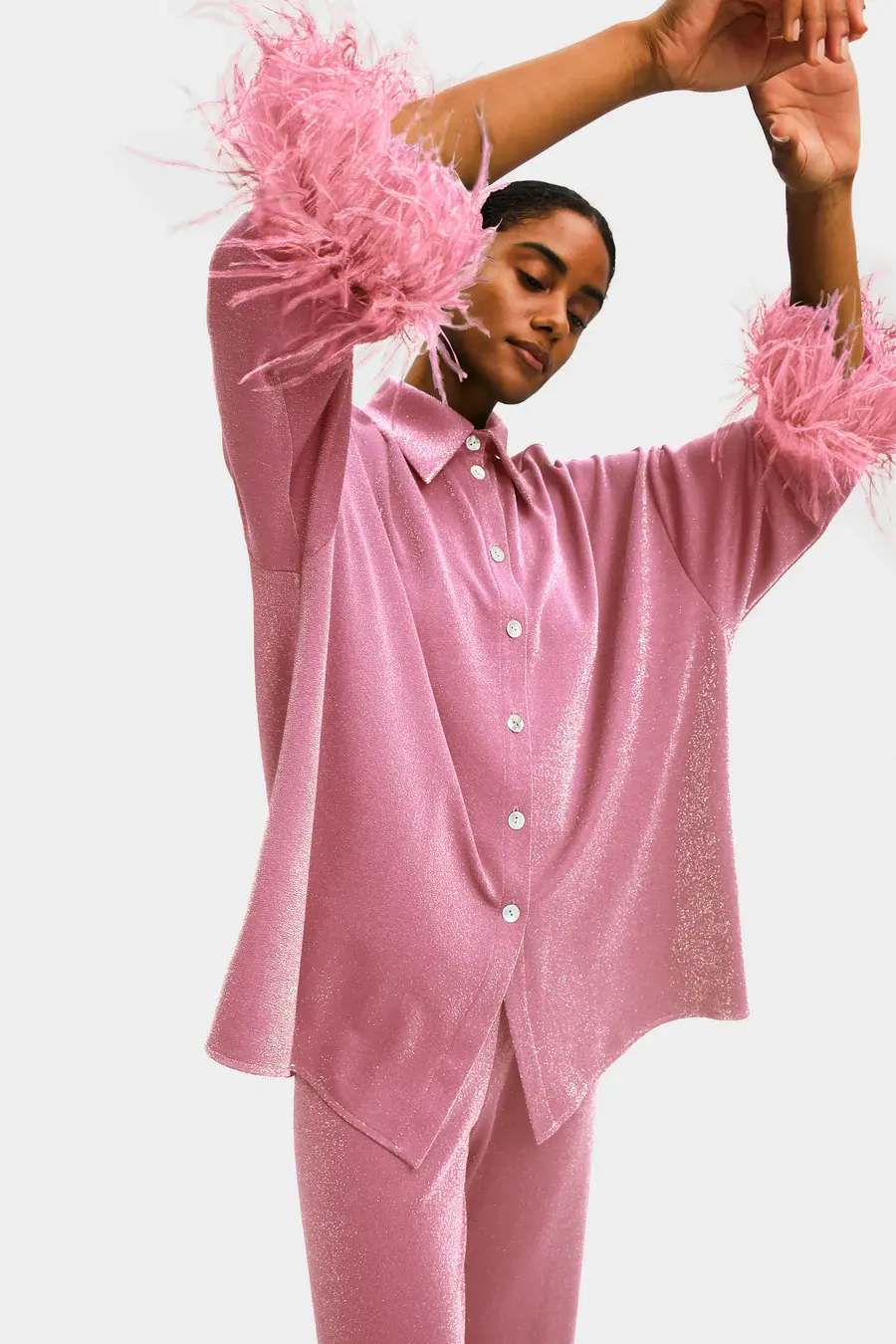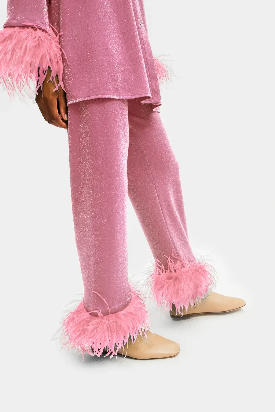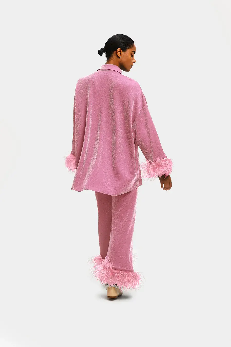 Oversized pajama shirt and pants set in shimmering pink lurex, generously cut for a comfortable fit. The shirt's fitted collar is followed by mother-of-pearl buttoning, while the gently-cropped pants have an elasticated waistband. Each piece is trimmed with a double layer of detachable ostrich feathers.