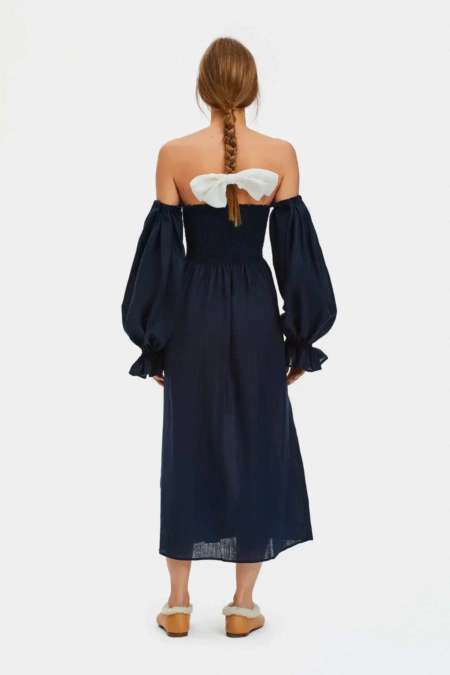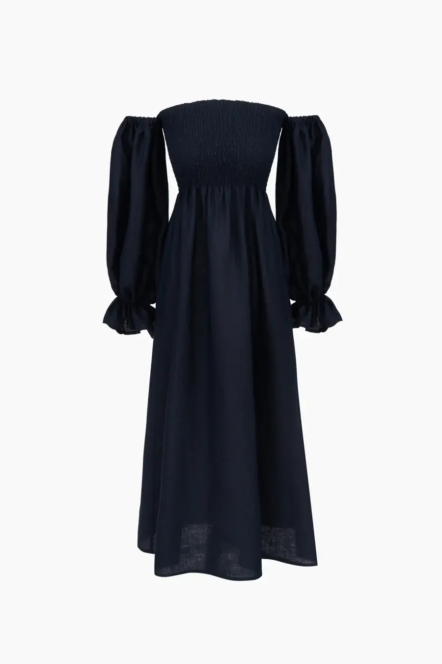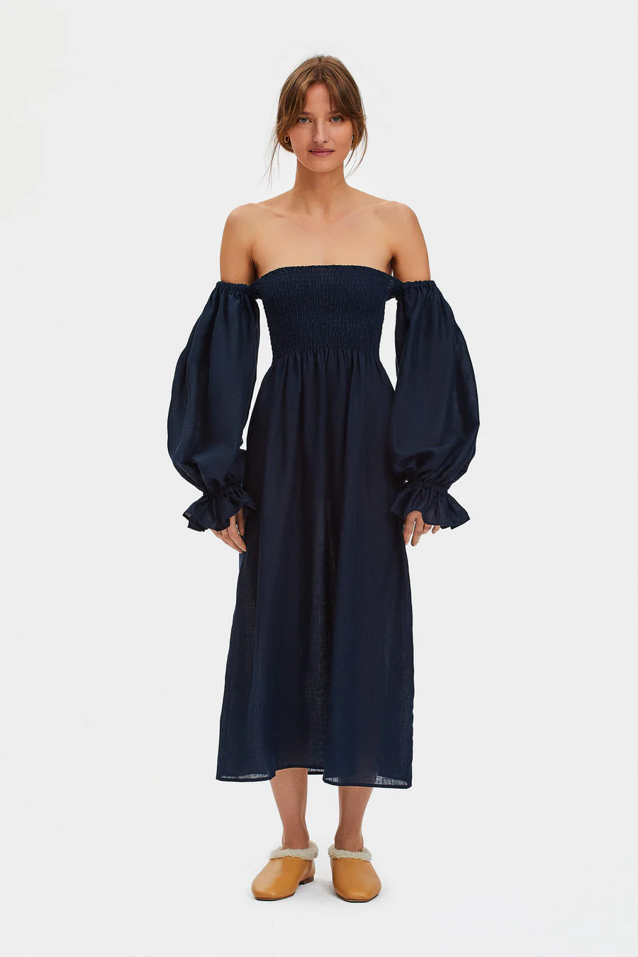 This navy Sleeper Atlanta linen midi dress features a square neck and back, long pouf sleeves, elasticated ruffled cuffs, a smocked bodice and flared skirt. One must always get one's beauty Sleep(er) from brownsfashion.com, like this Atlanta dress that will make you feel refreshed, energised and ready for anything