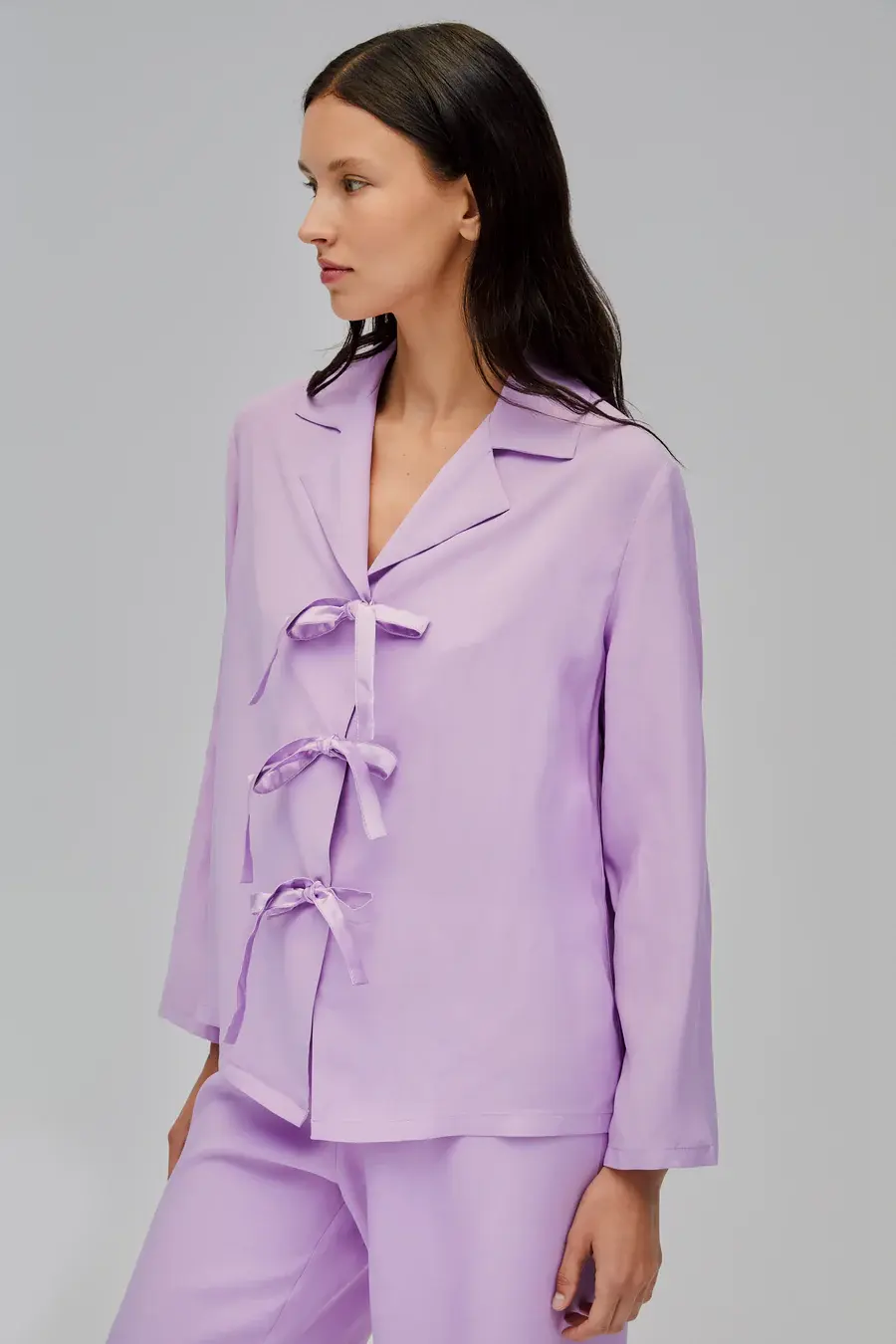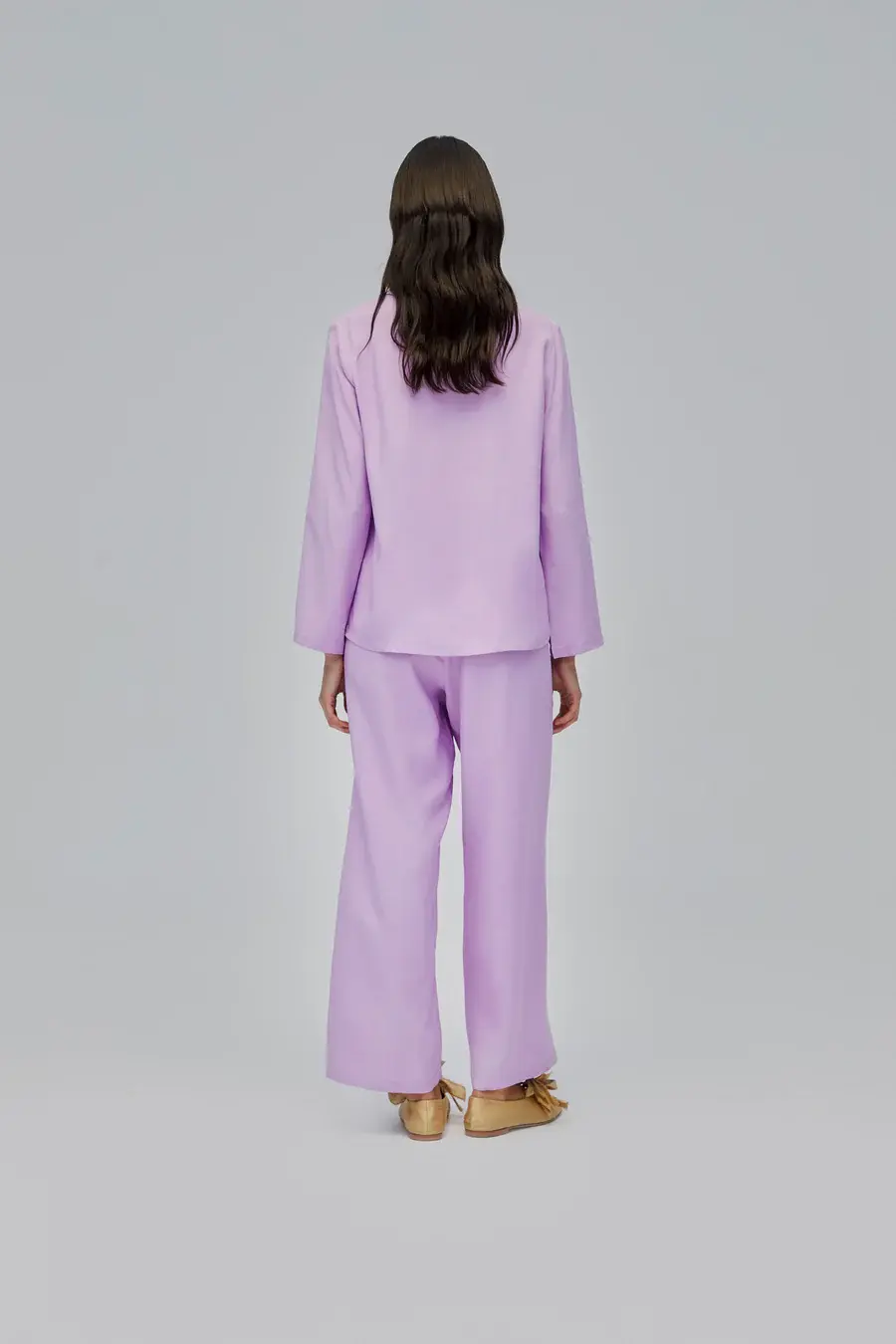 Relaxed lavender pajama set crafted in soft, lustrous viscose satin, featuring a long-sleeve shirt with three tie closures and a classic camp collar. The shirt is designed with a straight hem for a laid-back silhouette. Paired with wide-leg trousers that sit comfortably at the high waist and include side pockets for added practicality. Ideal for cozy nights or daytime lounging, combining ease with elegance.