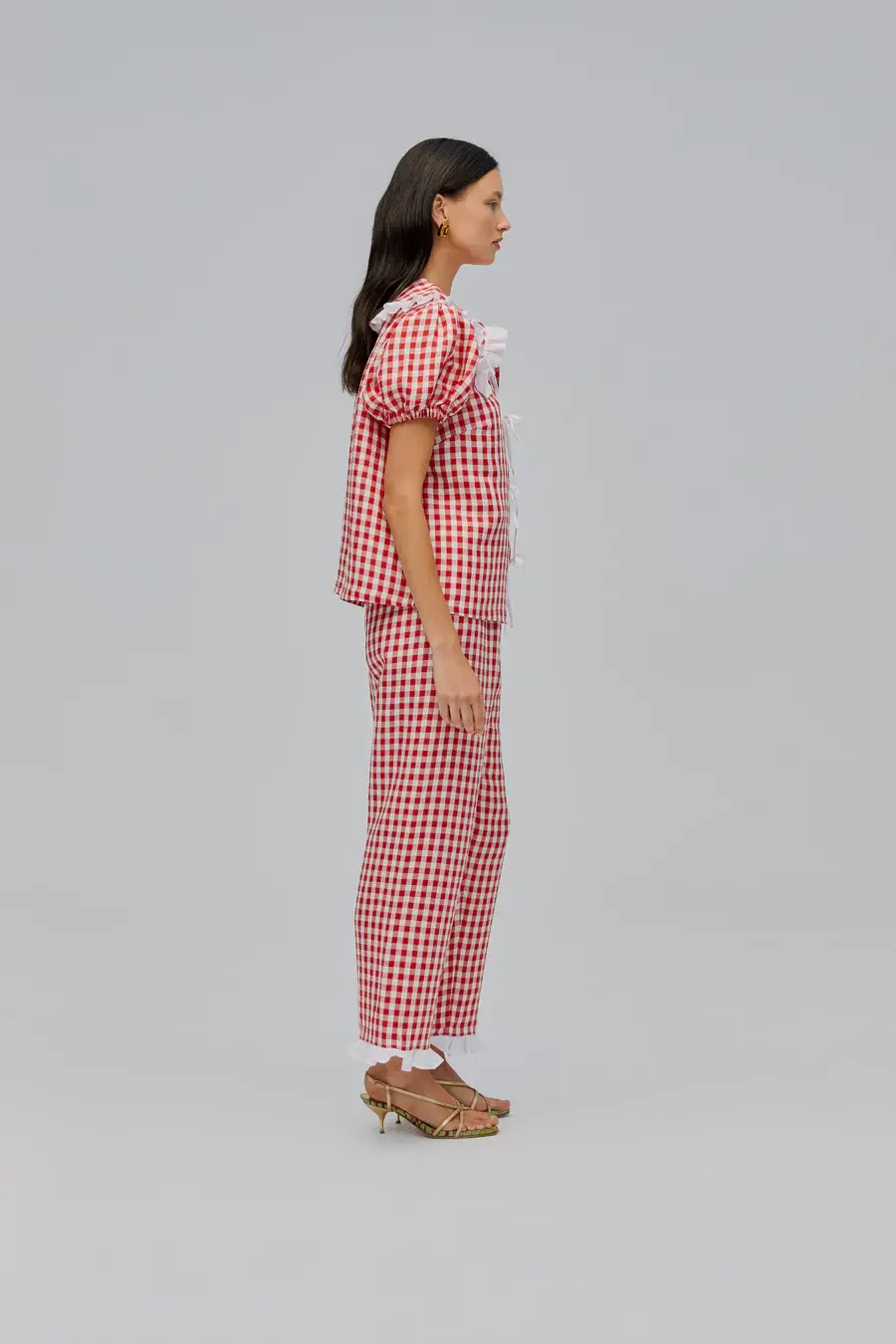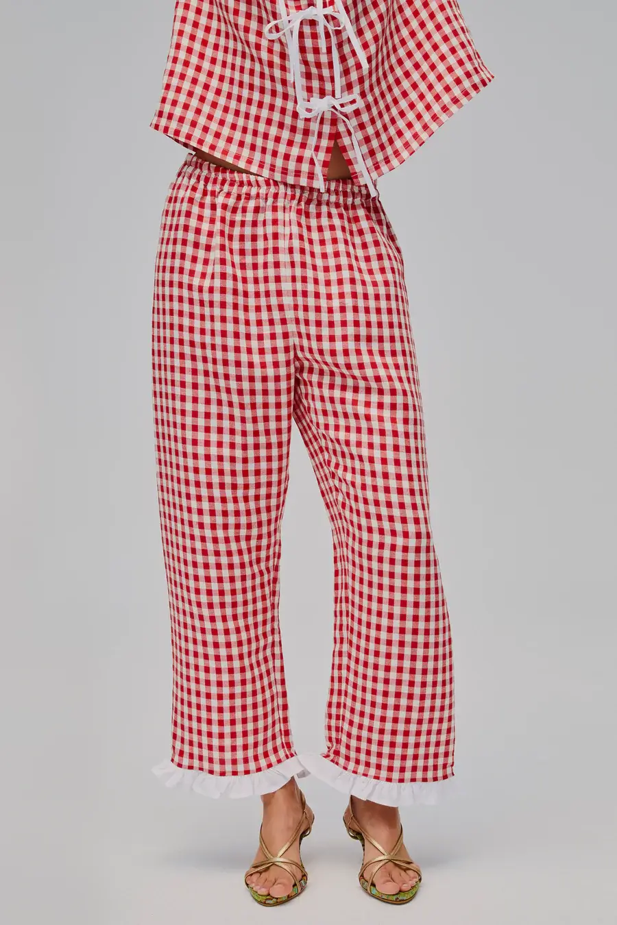 The Puff Linen Lounge Pants in Red Vichy are the epitome of effortless comfort with a touch of whimsy. Crafted from airy, breathable linen in a playful red vichy check, they feature a relaxed wide-leg silhouette and charming ruffled hems for a fun finish. Designed for lounging but chic enough for stepping out, they pair perfectly with the Puff Linen Shirt in Red Vichy or Gaia Off-The-Shoulder Top. A dreamy balance of ease and elegance, these pants are made for slow mornings, sun-drenched afternoons, and everything in between.