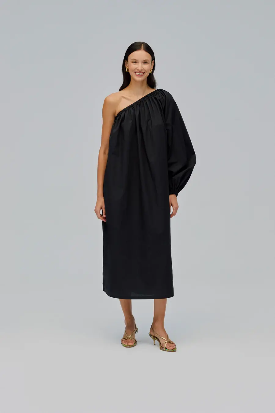 The Gaia Dress in Black is your go-to for effortless elegance, whether on vacation or in the city. Crafted from structured yet breathable cotton, it features a one-shoulder elastic neckline for adjustable draping and a billowy sleeve for an undone, effortless feel. Side splits add movement and ease, making it perfect for barefoot beach strolls or layered city moments. Dress it up, dress it down – Gaia Dress is perfect for both.