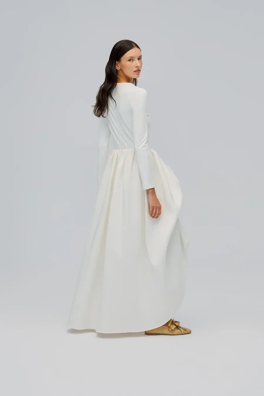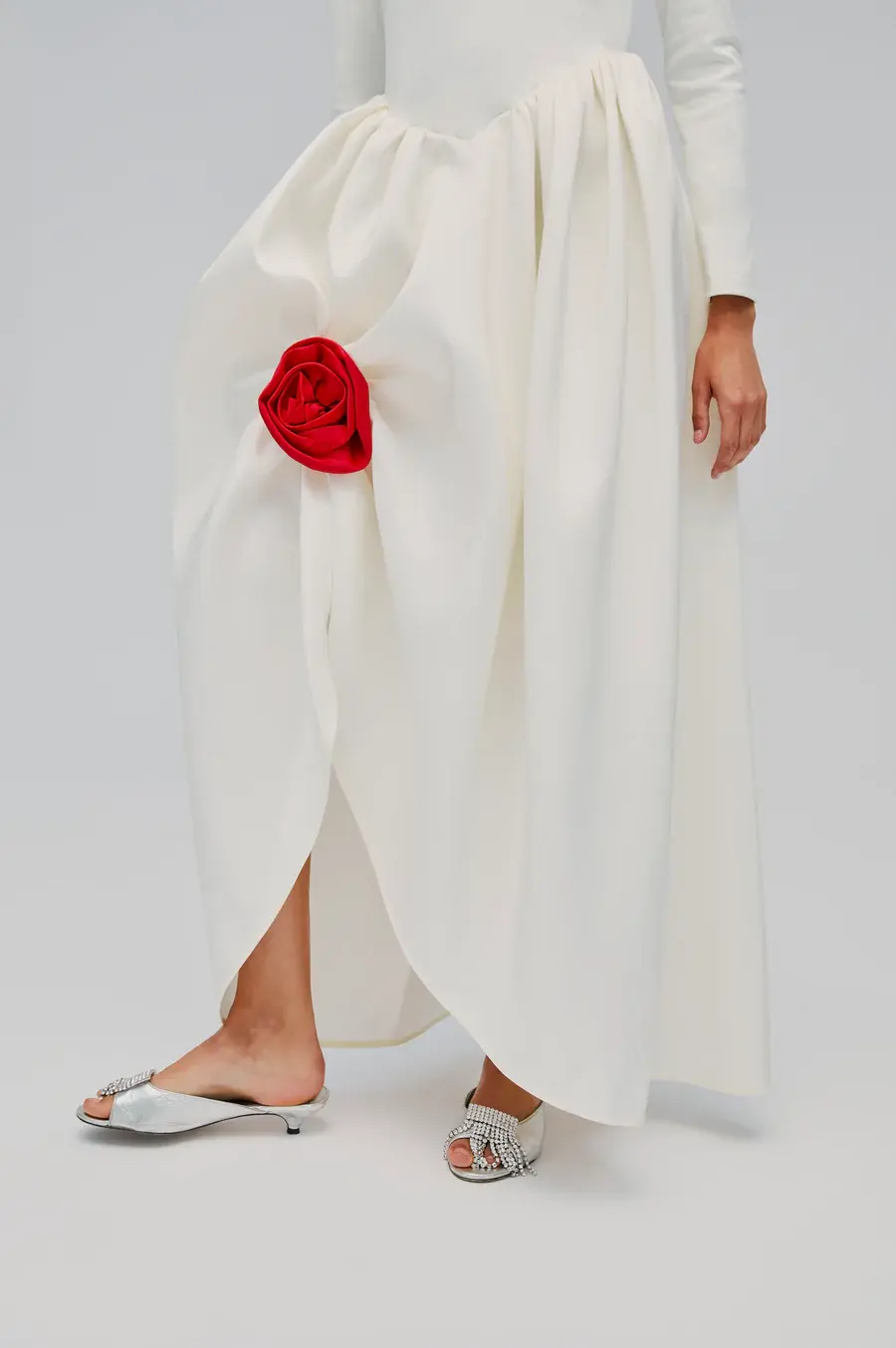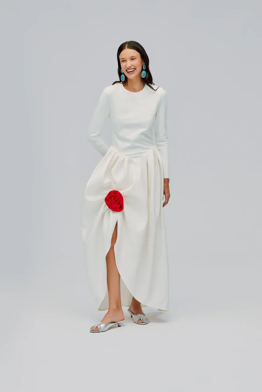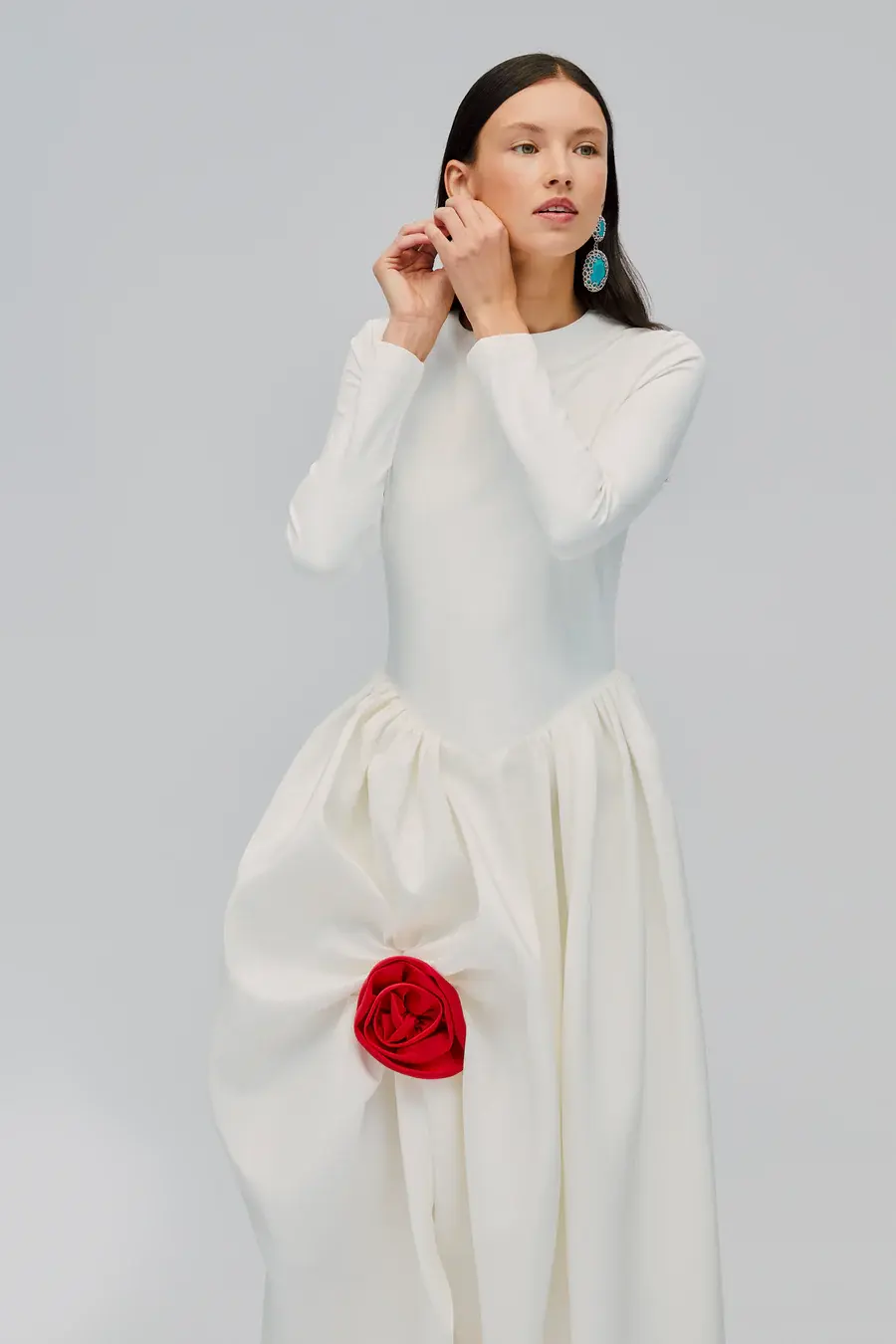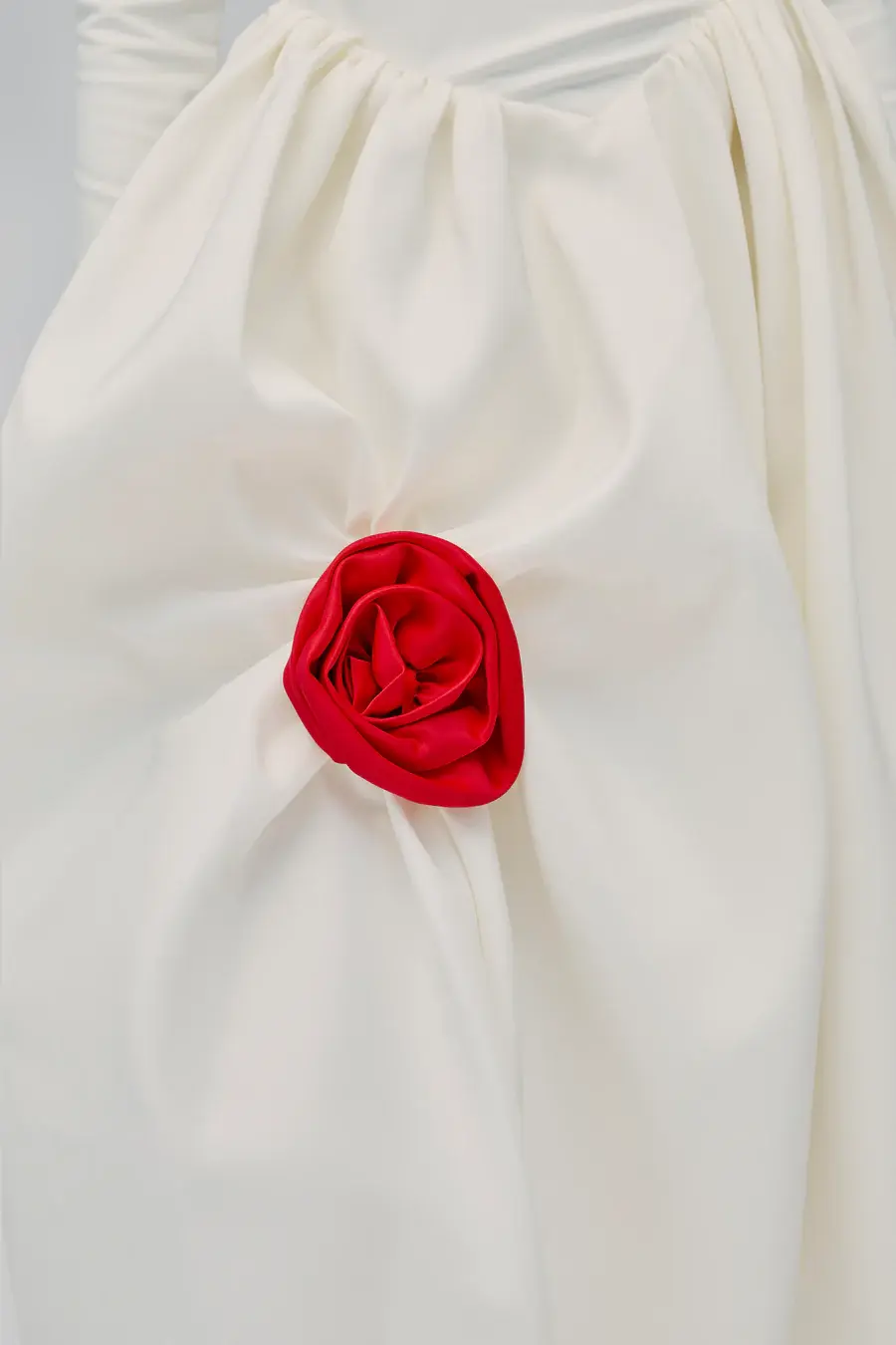 This elegant evening dress in white with red rose features a full skirt made from luxurious satin crepe taffeta, with a handcrafted rose detail at the hip. The v-shaped gathered waist creates a flattering silhouette, and the fitted stretch jersey top ensures comfort and elegance. Designed with a concealed tonal zip, the dress adds a sophisticated touch to any special event. Ideal for weddings, cocktail parties, or a romantic evening out, this dress can be styled with nude heels and a simple, elegant bracelet for an effortless polished look.