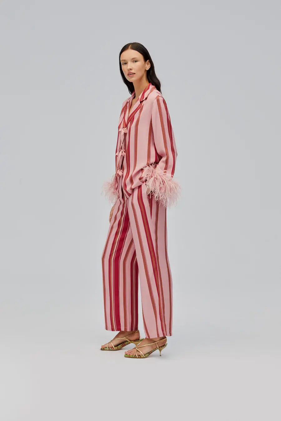 Relaxed pajama set in lightweight, breathable viscose with stylish stripes. The long-sleeve shirt features a dropped shoulder, hip-length cut, and a contrasting satin bow closure for a refined touch. Paired with high-waisted, straight-leg pants with a cropped hem and side pockets. Detachable feather cuffs add a statement detail, making it effortlessly chic for lounging or brunch with friends.