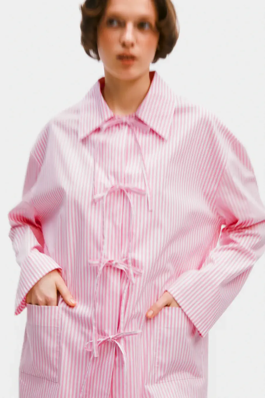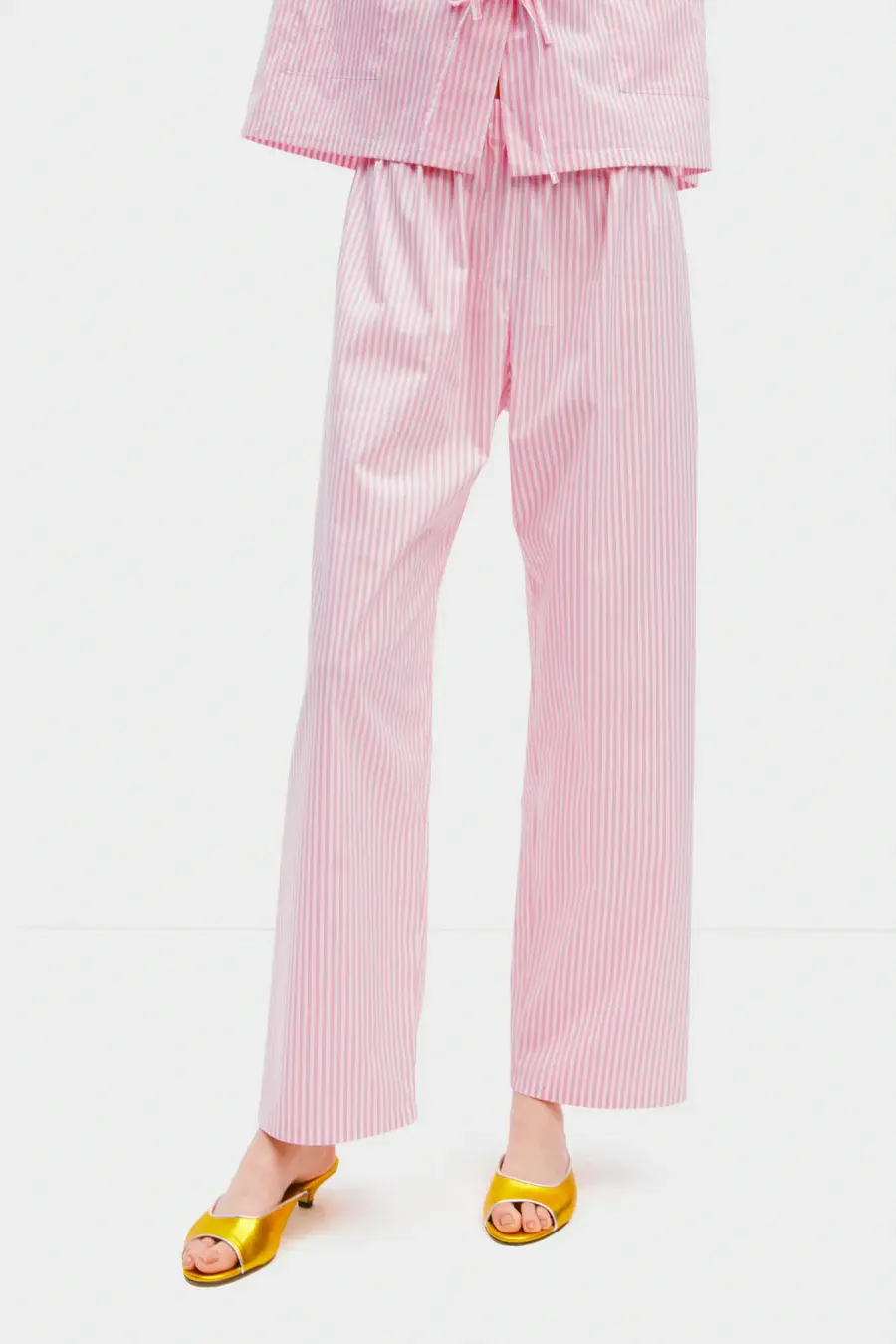 The Lyra Cotton-Poplin Pajama Set in pink stripes offers a relaxed fit with refined detailing. The long-sleeve shirt features a concealed bow fastening, camp collar, and two flap pockets with piping. The shirt’s concealed bow closure and the wide-leg, floor-length trousers make this set ideal for sophisticated lounging or a cozy night in.