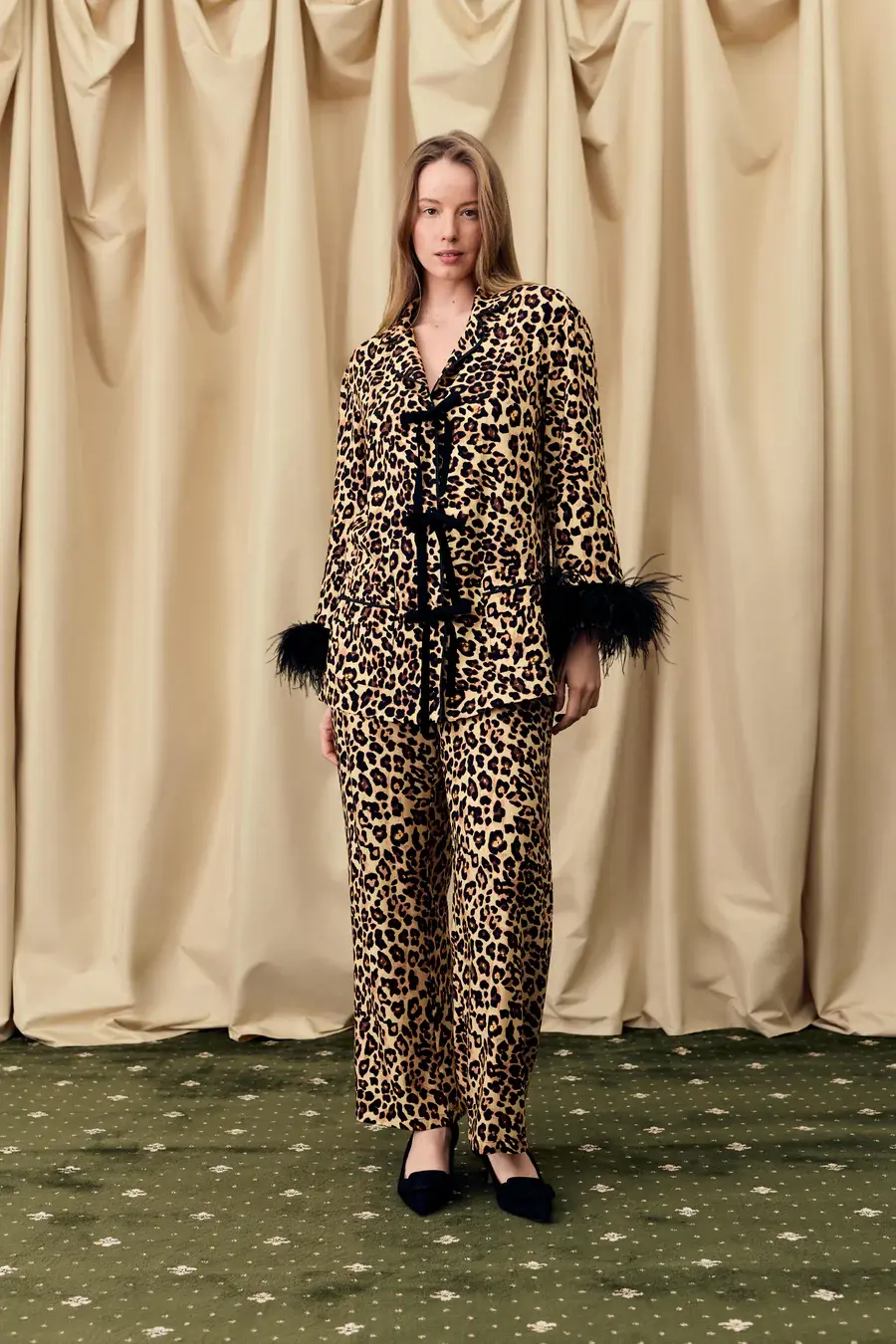 A love letter to late mornings and cozy homewear. This set is made from lightweight, eco-certified viscose. The loose silhouette, off-the-shoulder shirt and long pants create comfort, while velvet bows and contrast piping add vintage charm. Removable feather cuffs for impact and practicality.