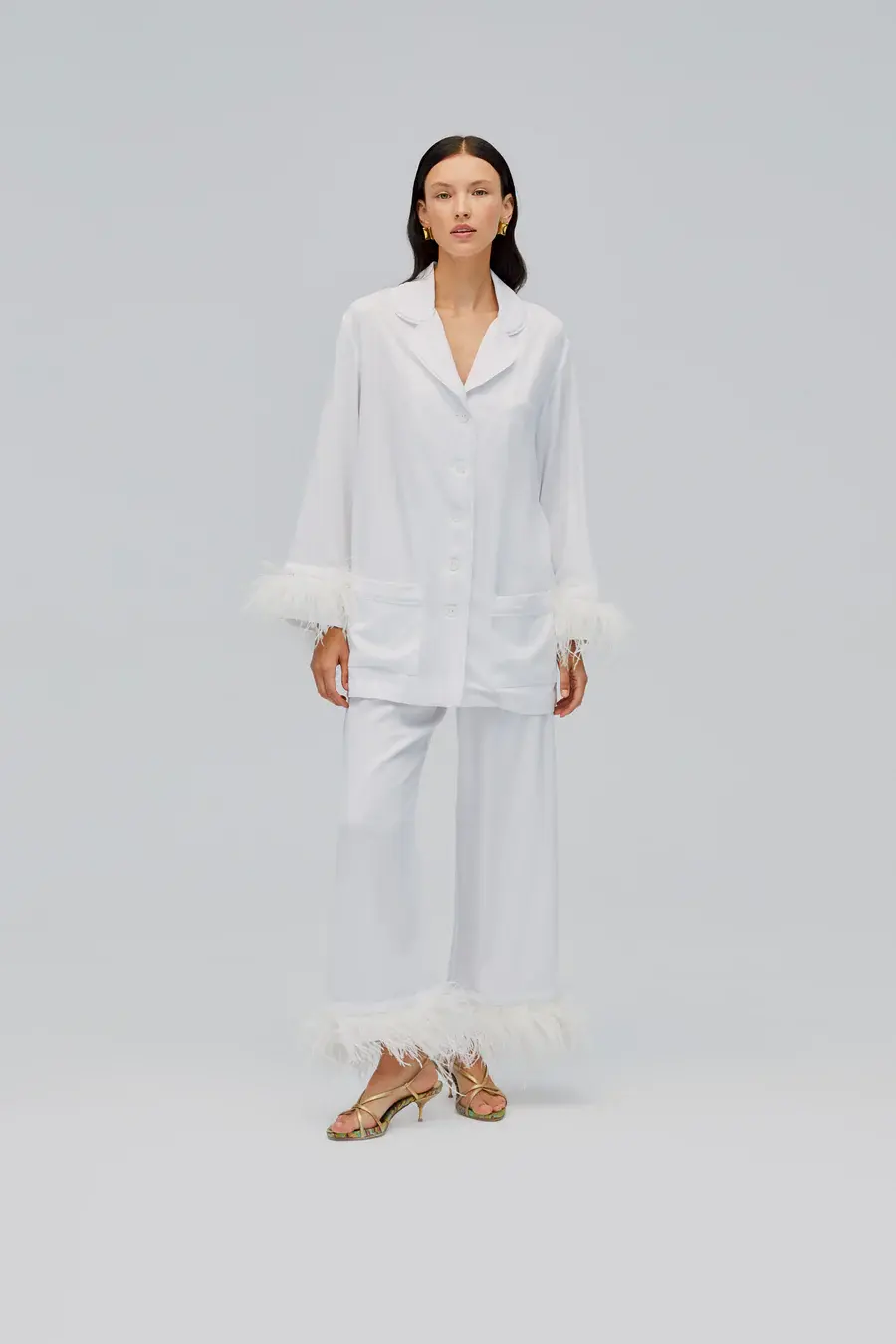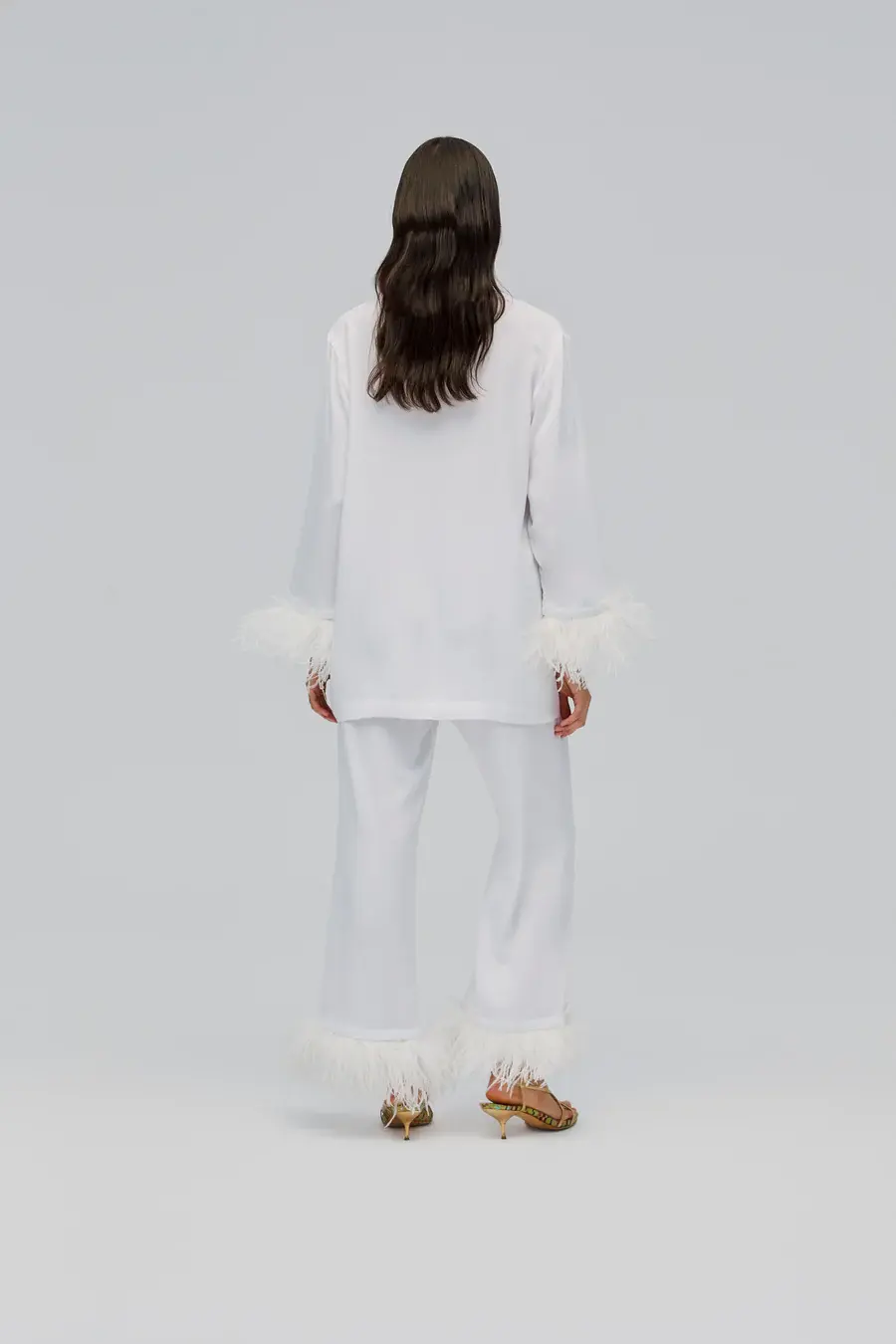 The signature SLEEPER party pajamas continue to be our best-selling style. A relaxed pajama shirt and pants set are cut from soft white certified viscose, trimmed with a double layer of detachable ostrich feather cuffs. The shirt features a cropped sleeve length, as well as tonal piping at the rounded collar, button closure and pockets. The pants sit below the hip with a comfortable elastic waistband and straight silhouette. The set pairs just as easily with slippers as it does with heels.