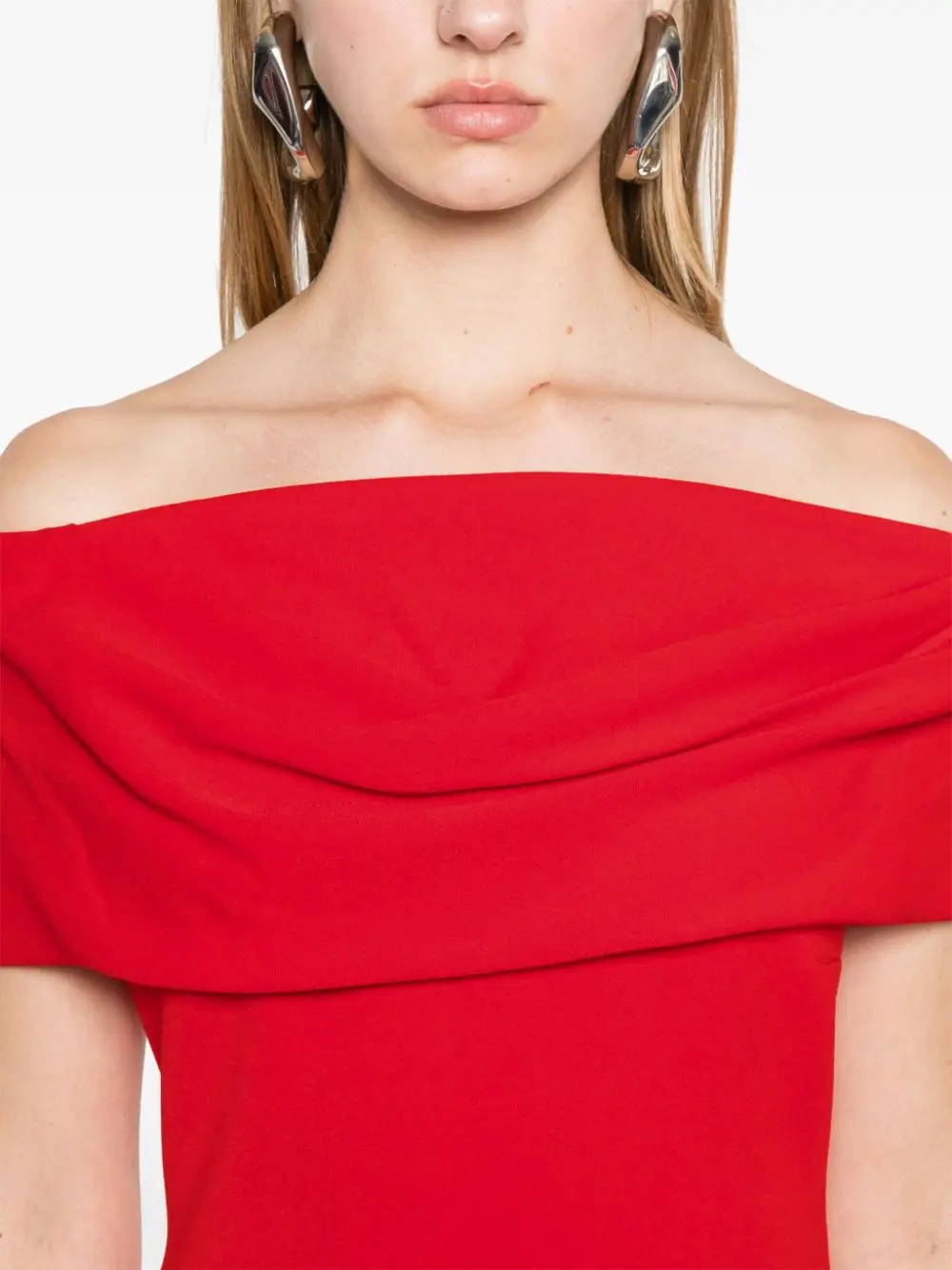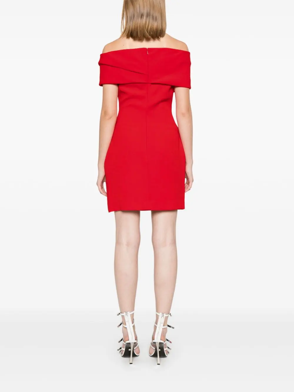 Neve mini dress Highlights red crepe texture concealed rear hook and zip fastening off-shoulder Bardot neckline draped detailing sleeveless bodycon design straight hem thigh-length Composition Polyester 100% Washing instructions Dry Clean Only