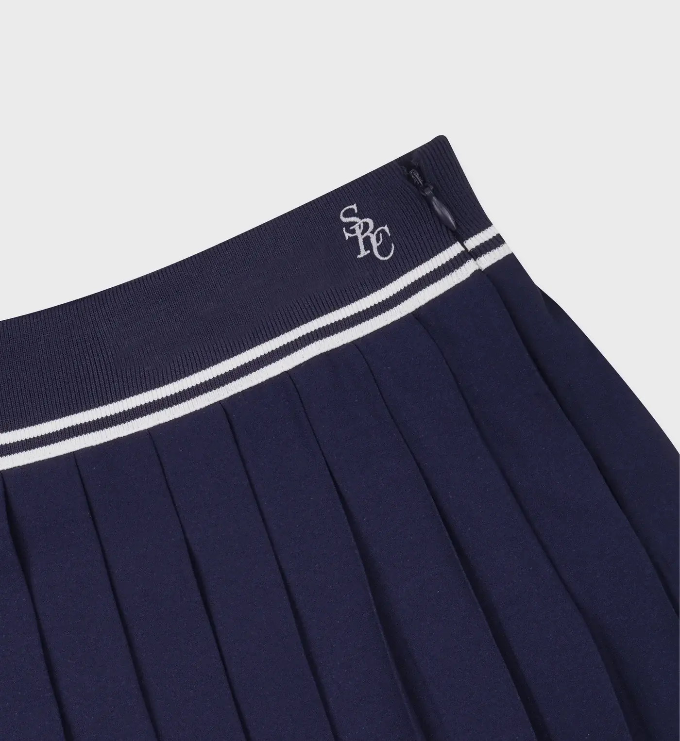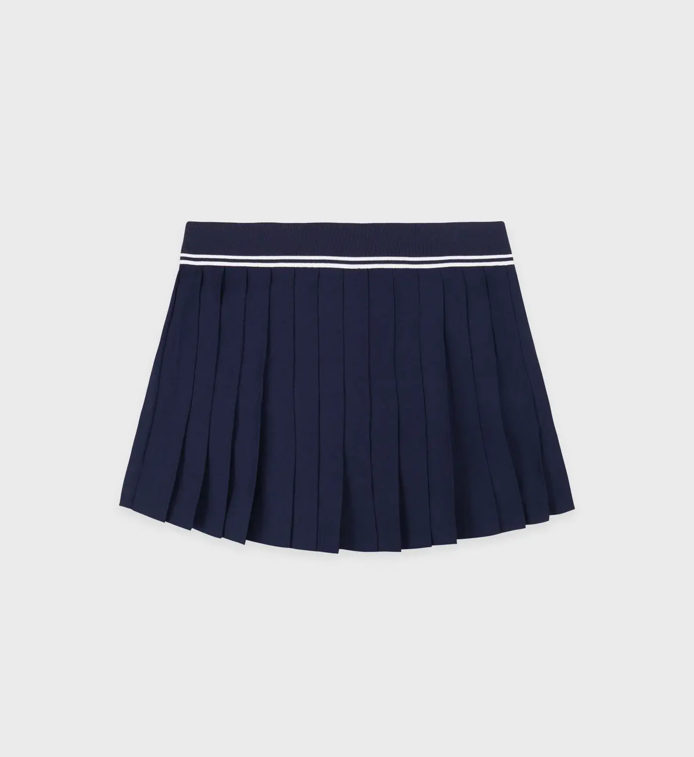 This super short skirt is made of flat pleated crepe with a ribbed belt. It sits on the hips and features an invisible zipper hidden on the side.