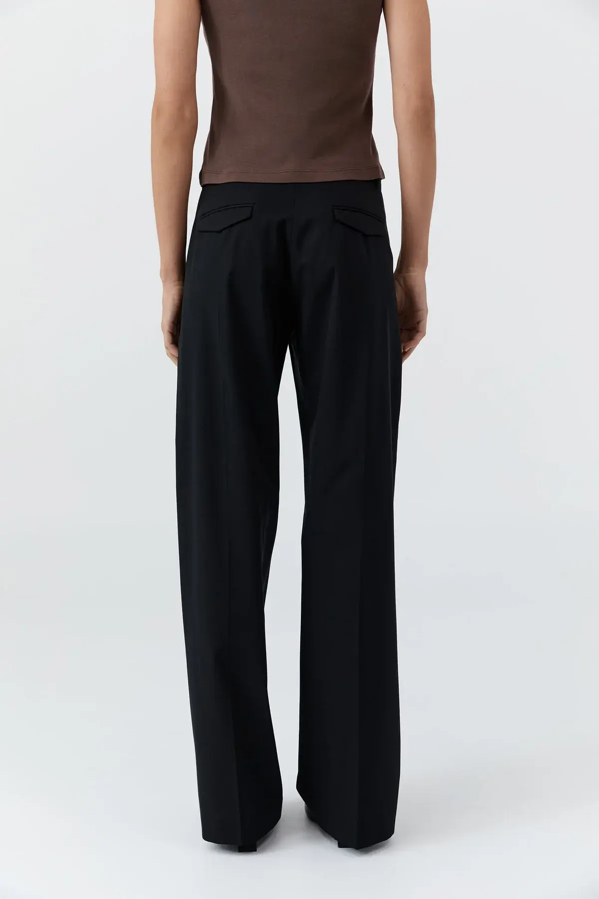 The Fine Band Carter Trouser is crafted from premium, responsibly sourced wool and cut to a tailored fit. Designed with a mid-rise waist and fine waistband, the silhouette falls to a straight leg accented by a pressed crease. Finished with front slash pockets and back flap pockets for a considered balance of function and refinement. Pair effortlessly with the 90s Wool Blazer for a tailored ensemble.