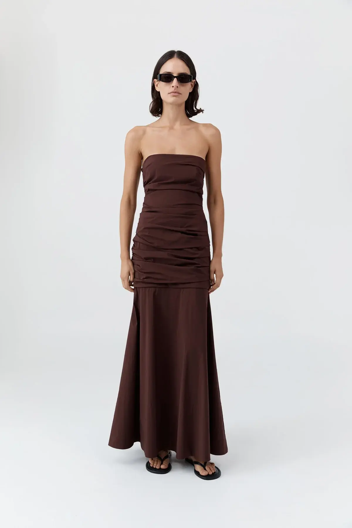 Crafted from a breathable blend of cotton and recycled nylon, the Gathered Strapless Longline Dress is designed with a fitted yoke waistband that defines the silhouette before falling into a full circle skirt at maxi length. The gathered construction enhances volume and movement, balancing structure with ease.