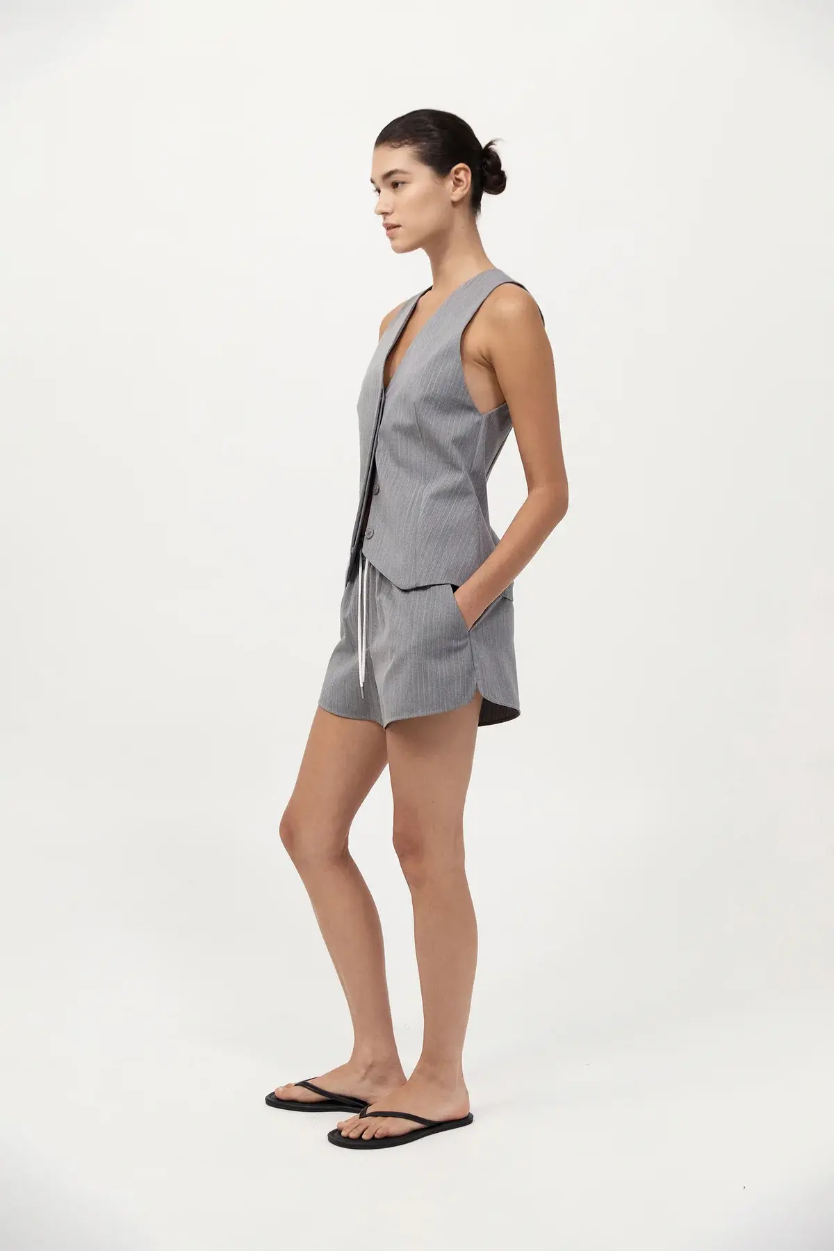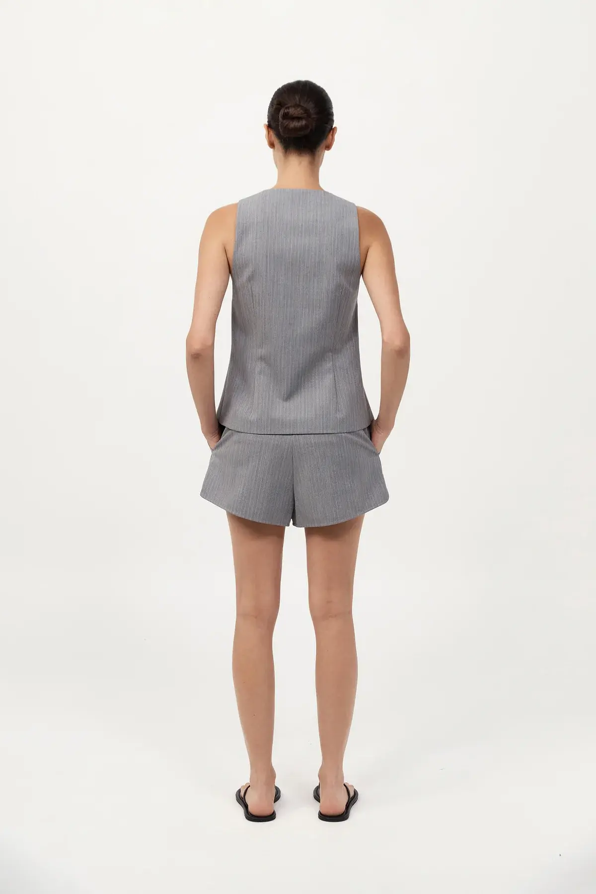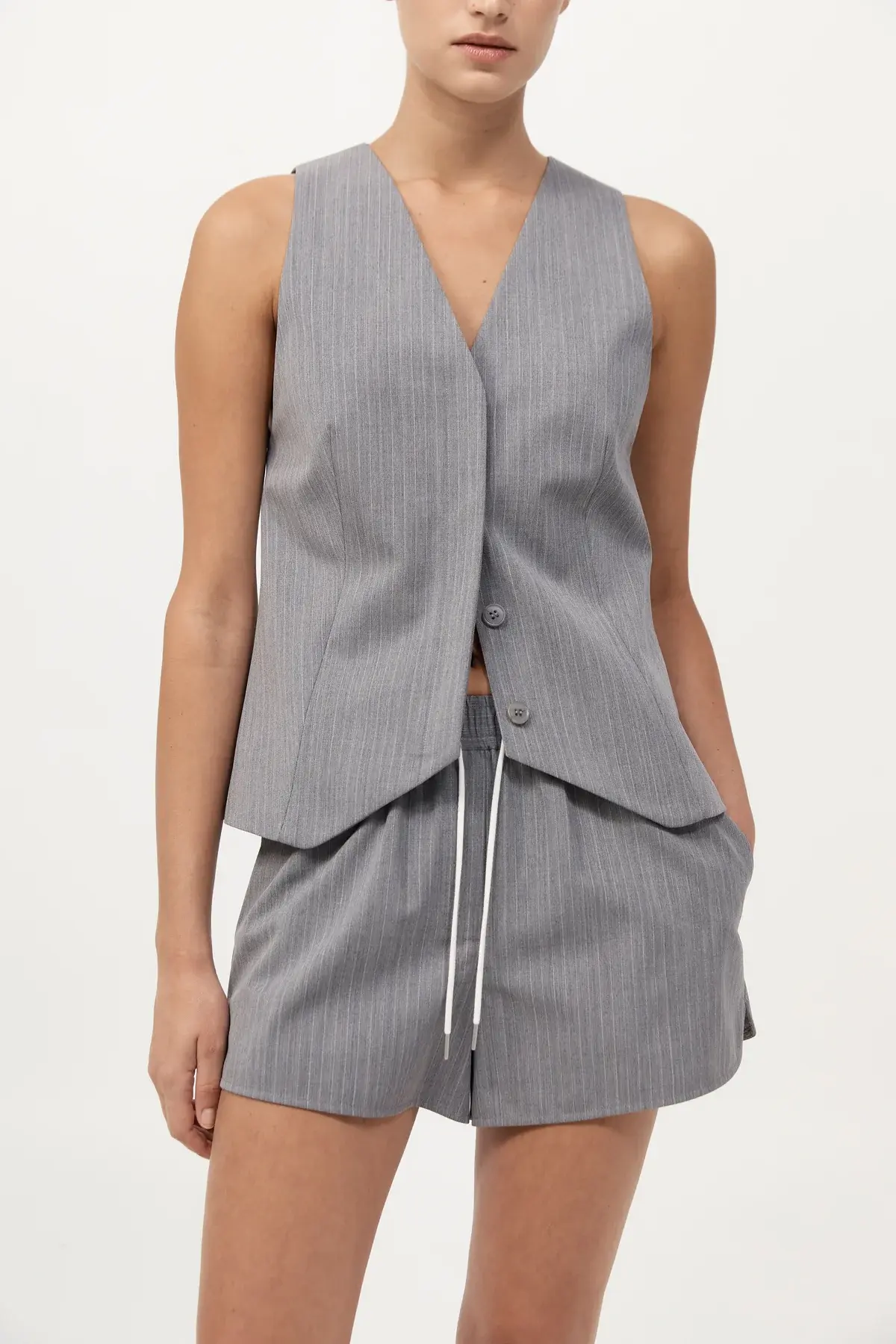The Pinstripe Wool Vest channels classic tailoring with a modern lens. Designed with a V-neckline and concealed button placket, featuring front darts for structure and fully lined for comfort. A versatile layering piece, Pair with the Tailored Boxer Shorts for a refined look.