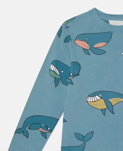 Playful and easy to wear, this tracksuit set features an all-over whale print inspired by this season’s ocean-themed storytelling. Crafted from soft organic cotton fleece, the relaxed sweatshirt and matching joggers are designed for comfort, warmth, and everyday movement. A cosy, characterful set that brings a sense of imagination and calm to relaxed Spring Summer 2026 dressing.