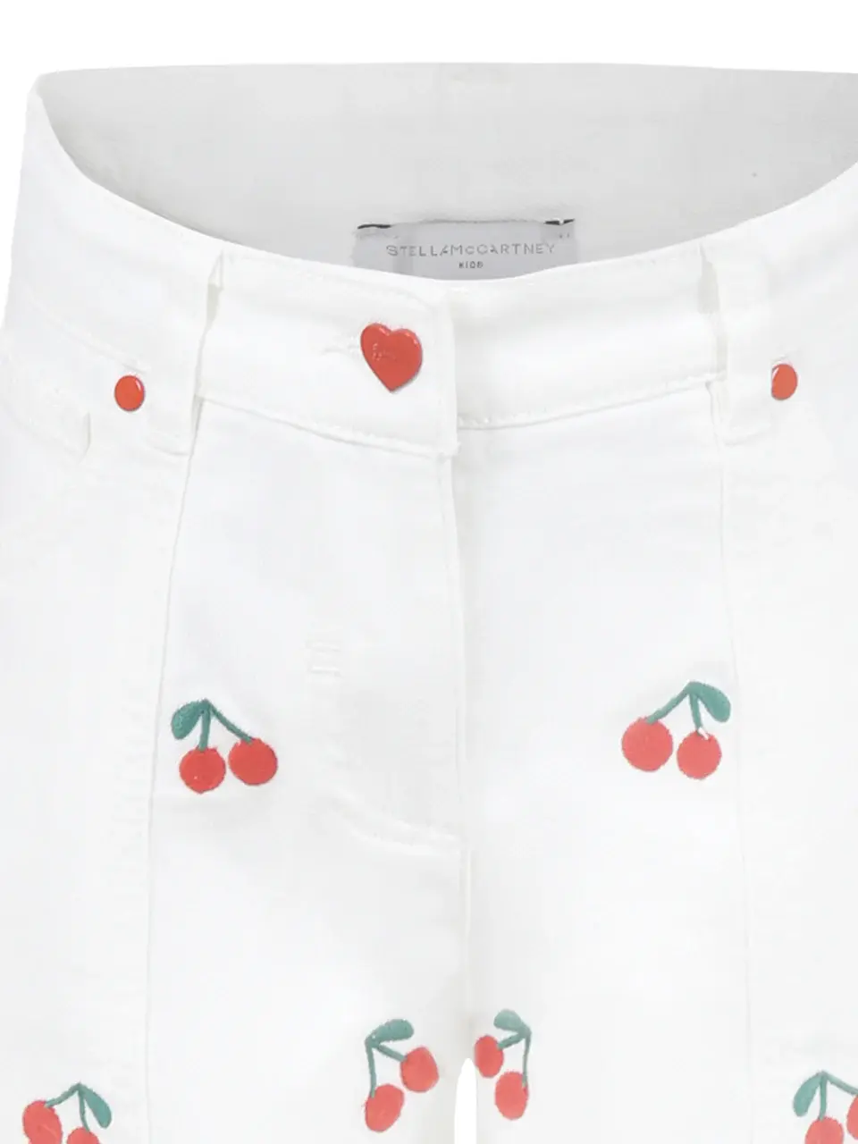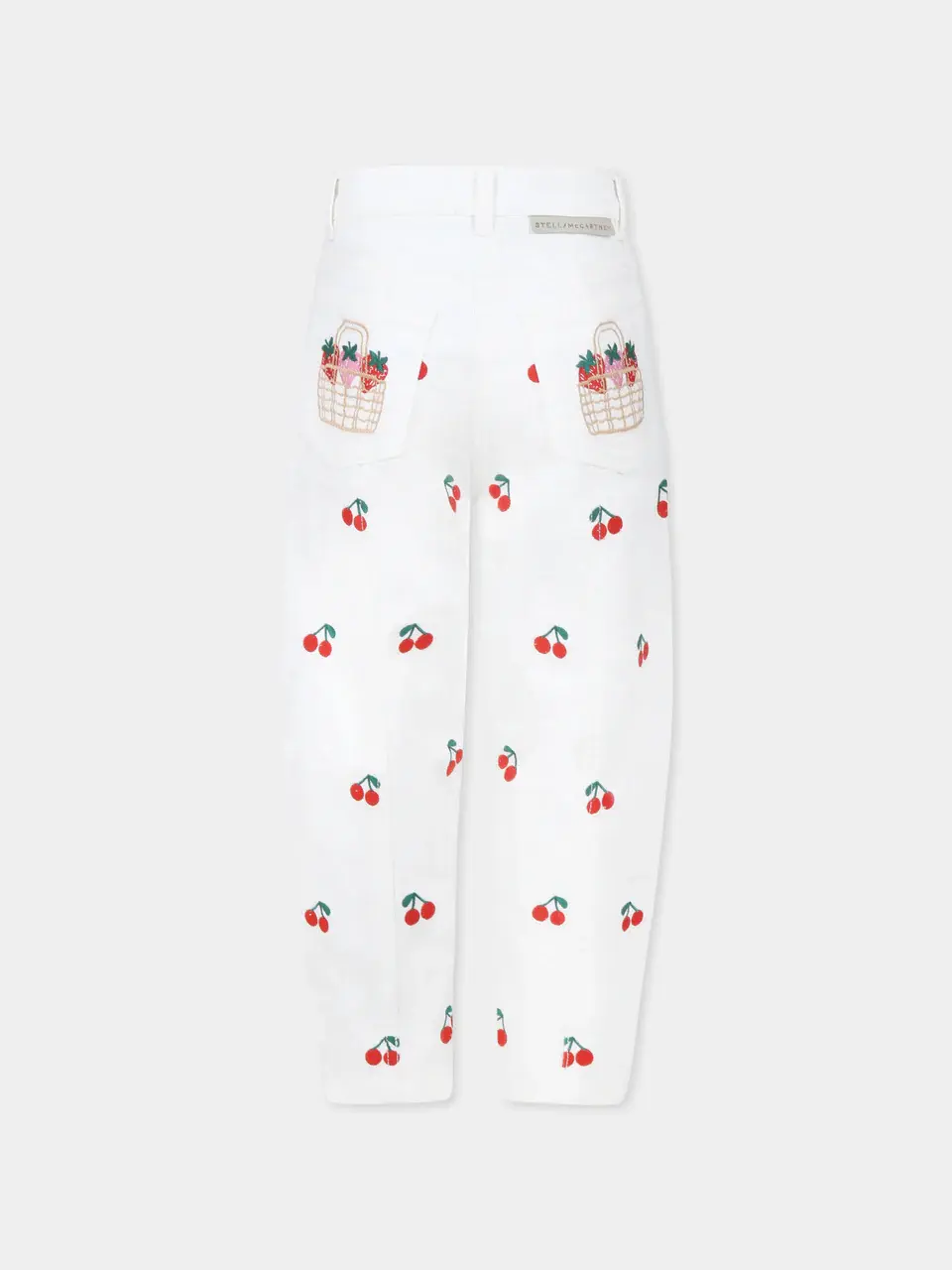 White five-pocket jeans, with belt loops, front zip and button fastening, adjustable waist thanks to internal elastic with buttons. They are embellished with all-over embroidered cherries and embroidered strawberries on the back pockets.