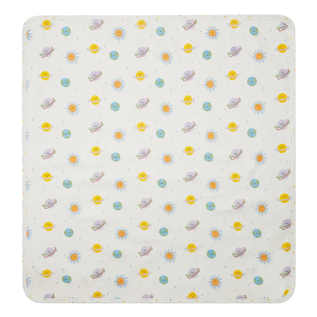 Four piece baby gift set Jersey with all over planets print Long sleeved jumpsuit with attached feet, lap shoulders, and snap closure between the legs Long sleeved bodysuit with a wrap style and snap closure down the side and between the legs Beanie with a fold up cuff Swaddle blanket 100% Organic Cotton