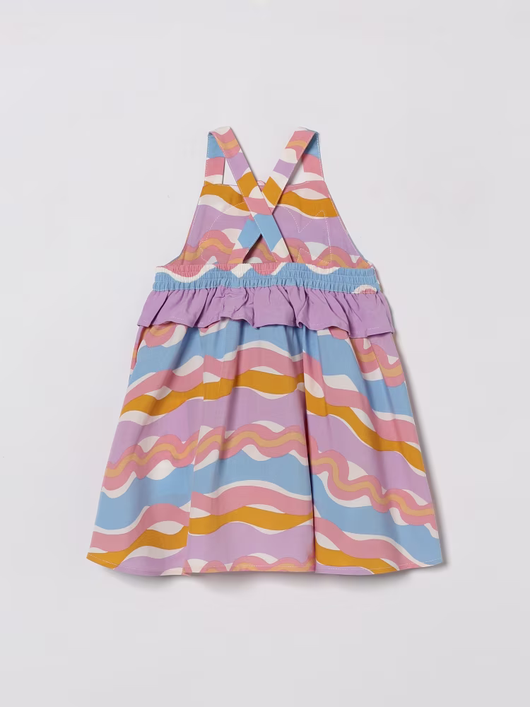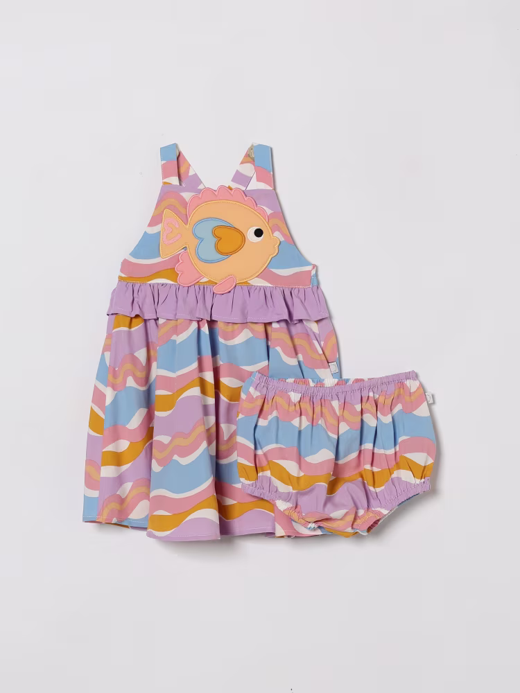 This Stella McCartney dress in viscose and lycra is a fresh, soft and practical garment for your little newborn. Featuring a colorful all-over geometric pattern with an embossed fish, it is paired with an elasticated diaper cover that completes the look with cheerfulness.