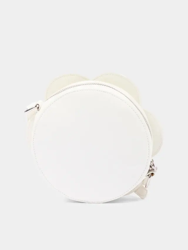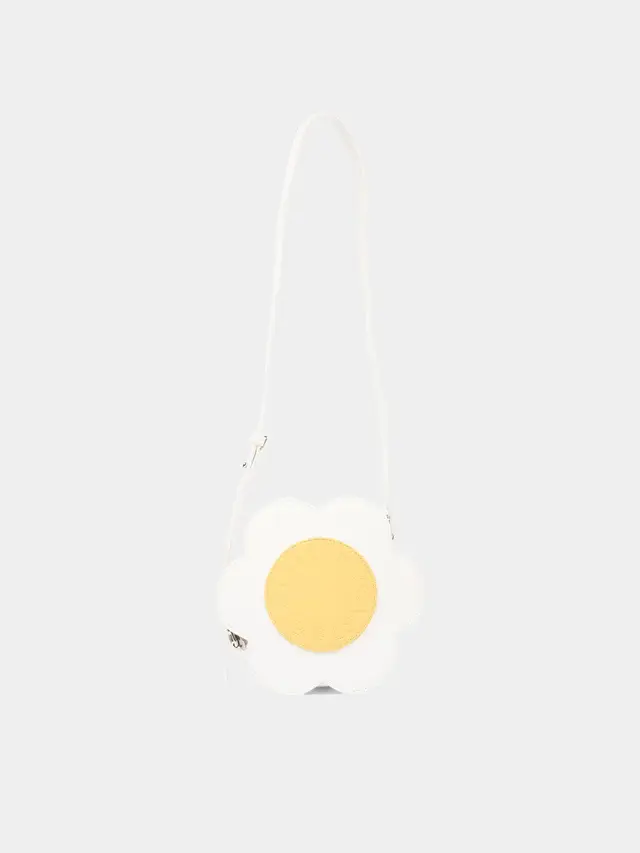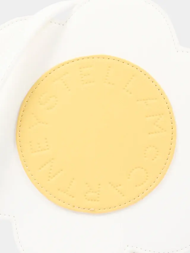 Ivory bag by Stella McCartney Kids in smooth leather-effect material with a soft flower-shaped silhouette. The front features a large pastel yellow round insert with a perforated circle logo, while the back remains clean and compact. The adjustable shoulder strap allows for wearing it on the shoulder or crossbody, and the top zip closure keeps essentials secure. The round volume with overlapping petals creates a delicate and recognizable graphic effect.