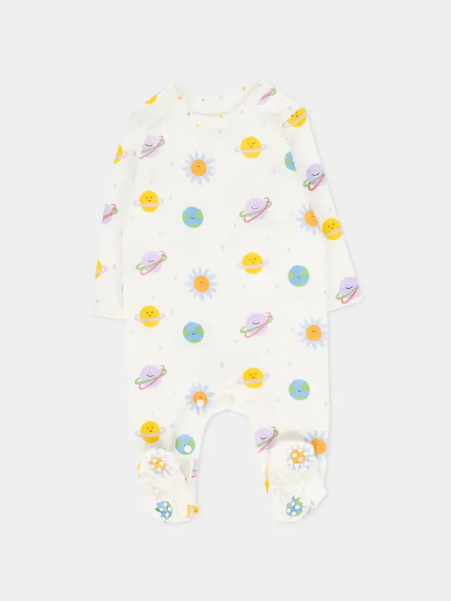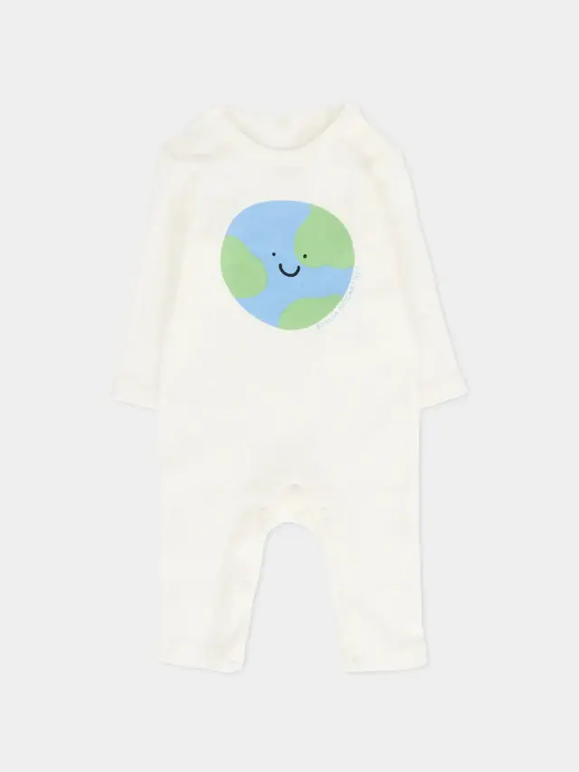 Ivory organic cotton jumpsuit set, consisting of two jumpsuits. One, long-sleeved, features a ribbed crew neck, snaps at the shoulders and crotch, and non-slip soles. It is decorated with an all-over planet print. The other, long-sleeved, features a ribbed crew neck, snaps at the shoulders and crotch, and a planet Earth print and logo on the front. Details: 100% Organic cotton. Wash at 30°C.