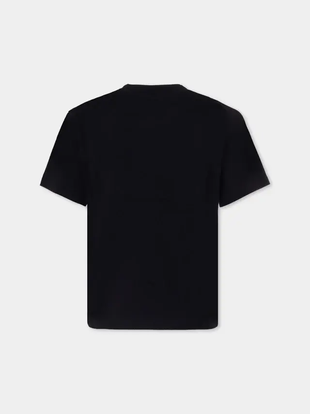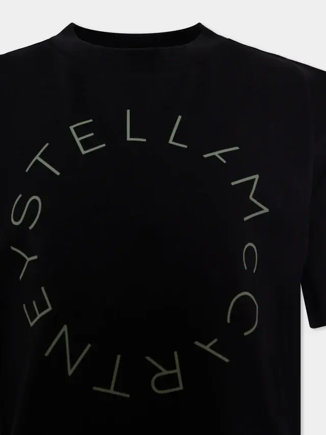 Black, short-sleeved T-shirt made from sustainable cotton, featuring a crew neck and ribbed hem. It features a green logo on the front.