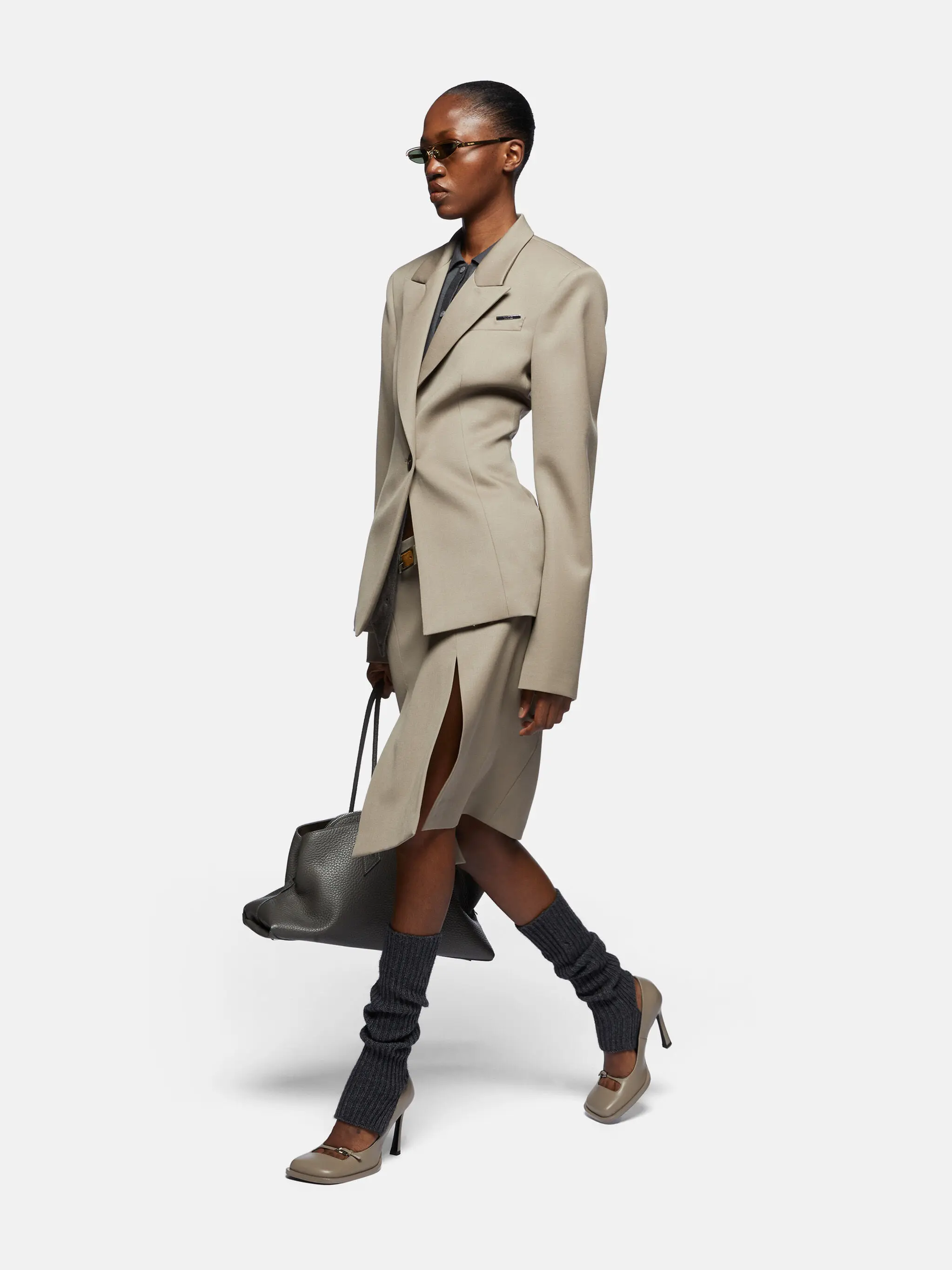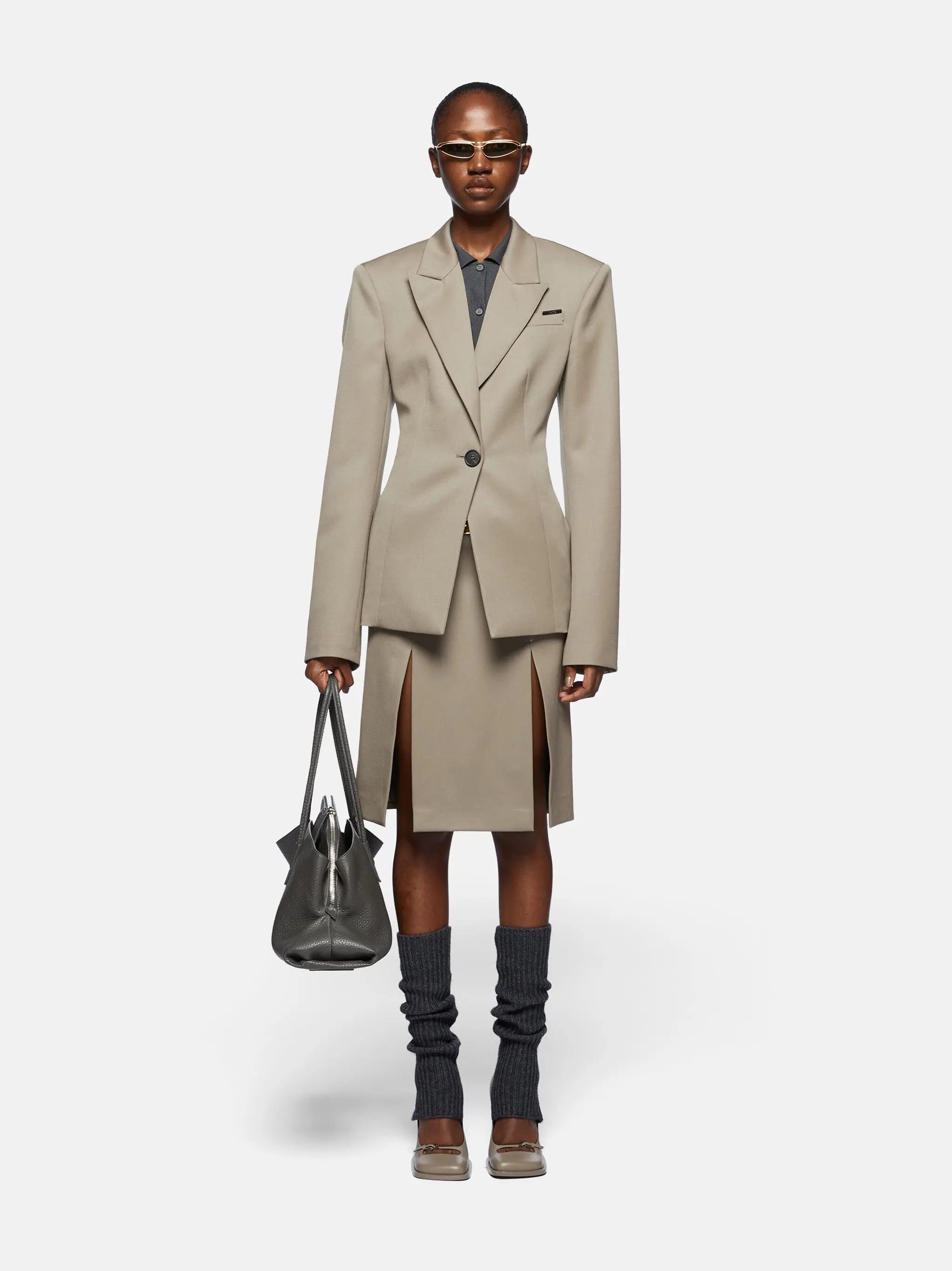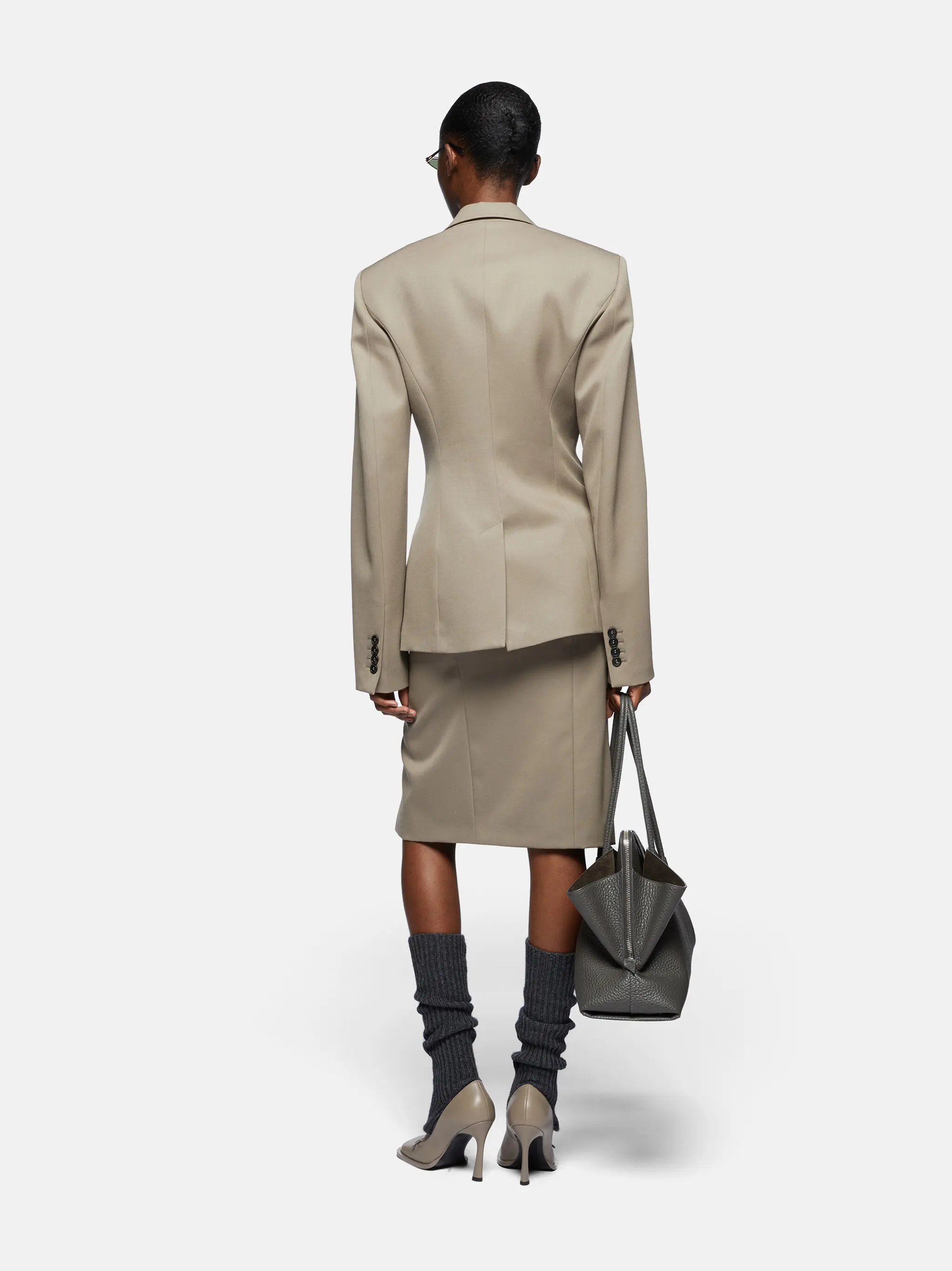 Blazer in taupe gabardine with wide sleeve, jacquard logo lining and logo button.